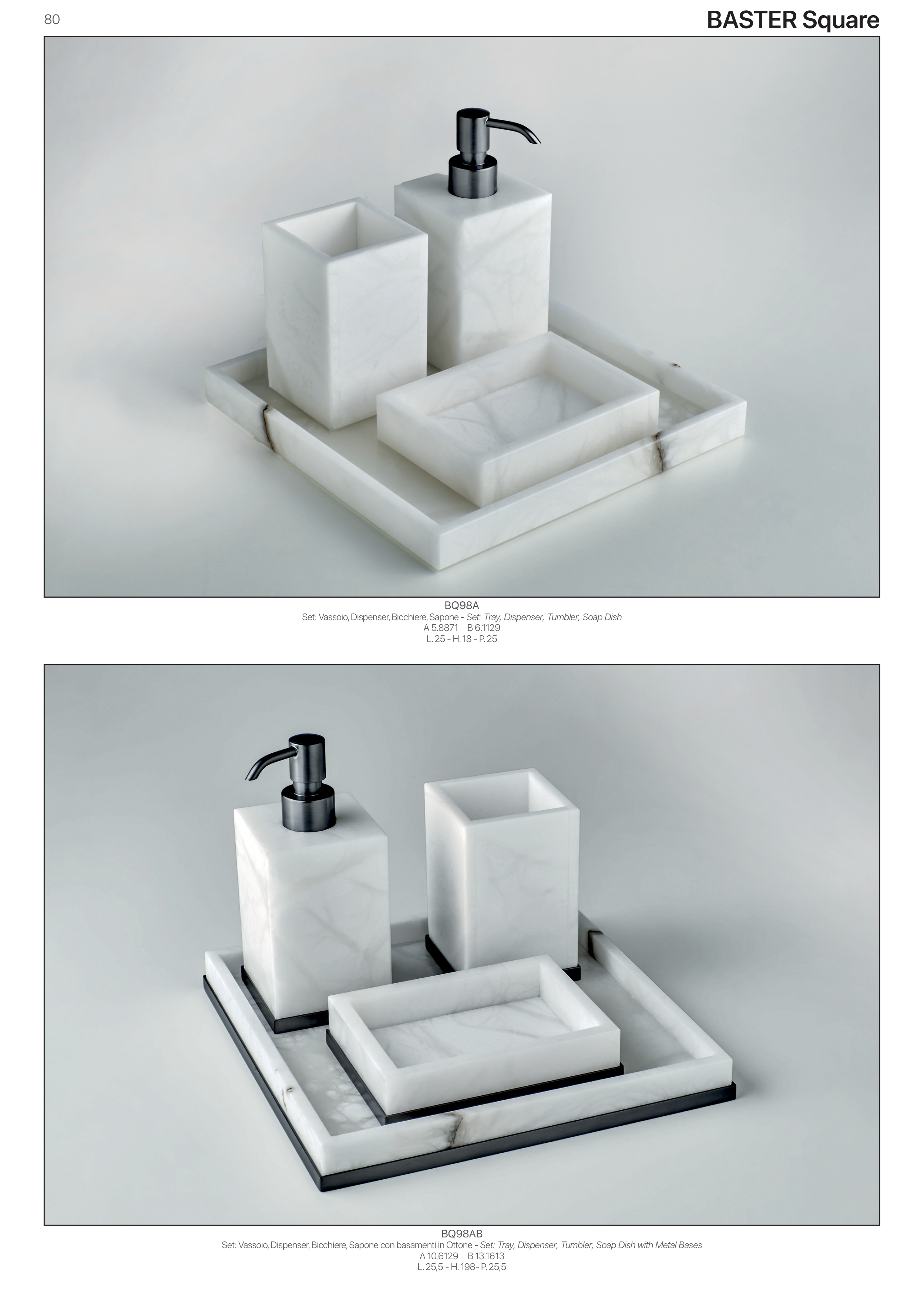 Set: Vassoio, Dispenser, Bicchiere, Sapone con basamenti in Ottone - Set: Tray, Dispenser, Tumbler, Soap Dish with Metal Bases
