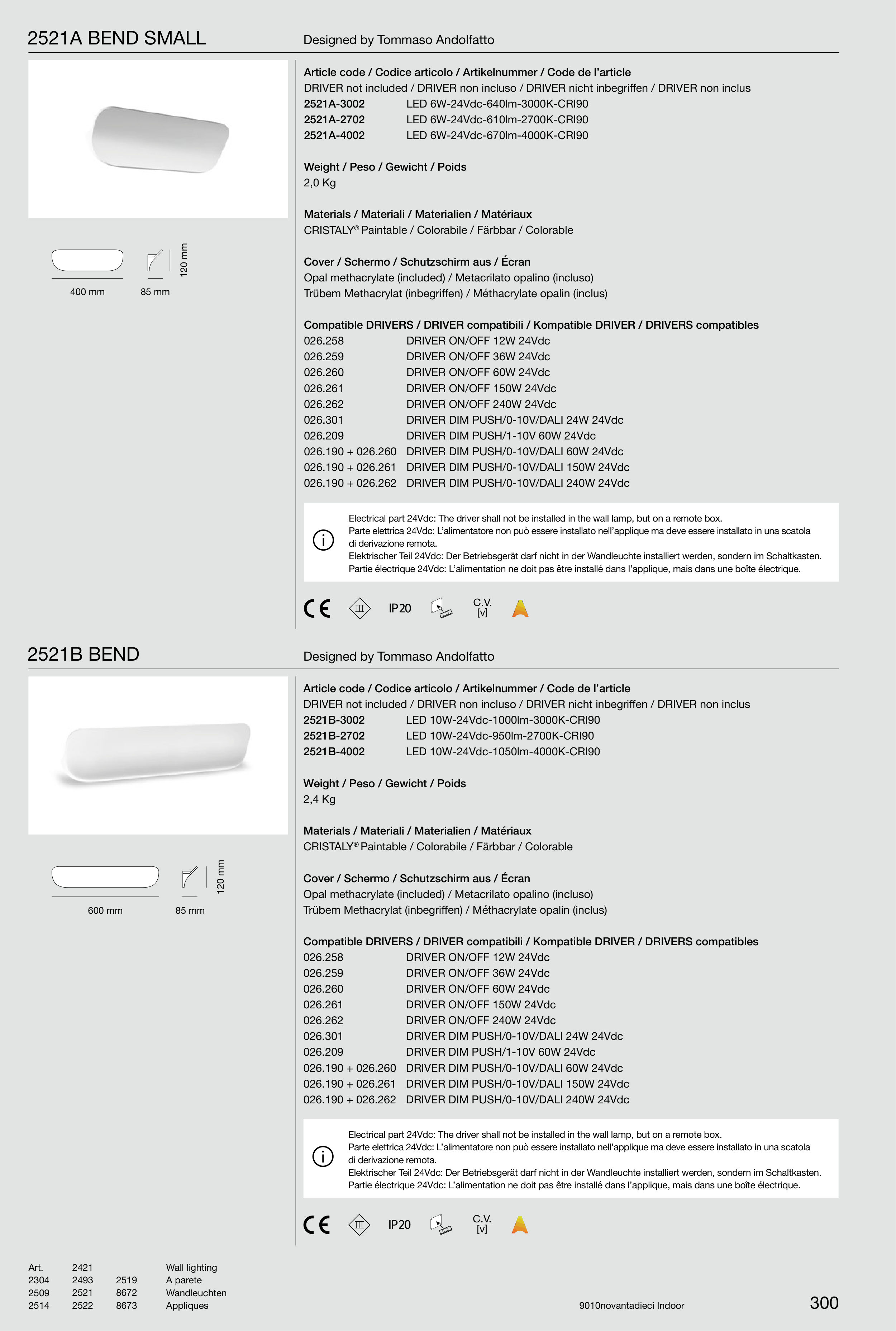 Electrical part 24Vdc: The driver shall not be installed in the wall lamp, but on a remote box.