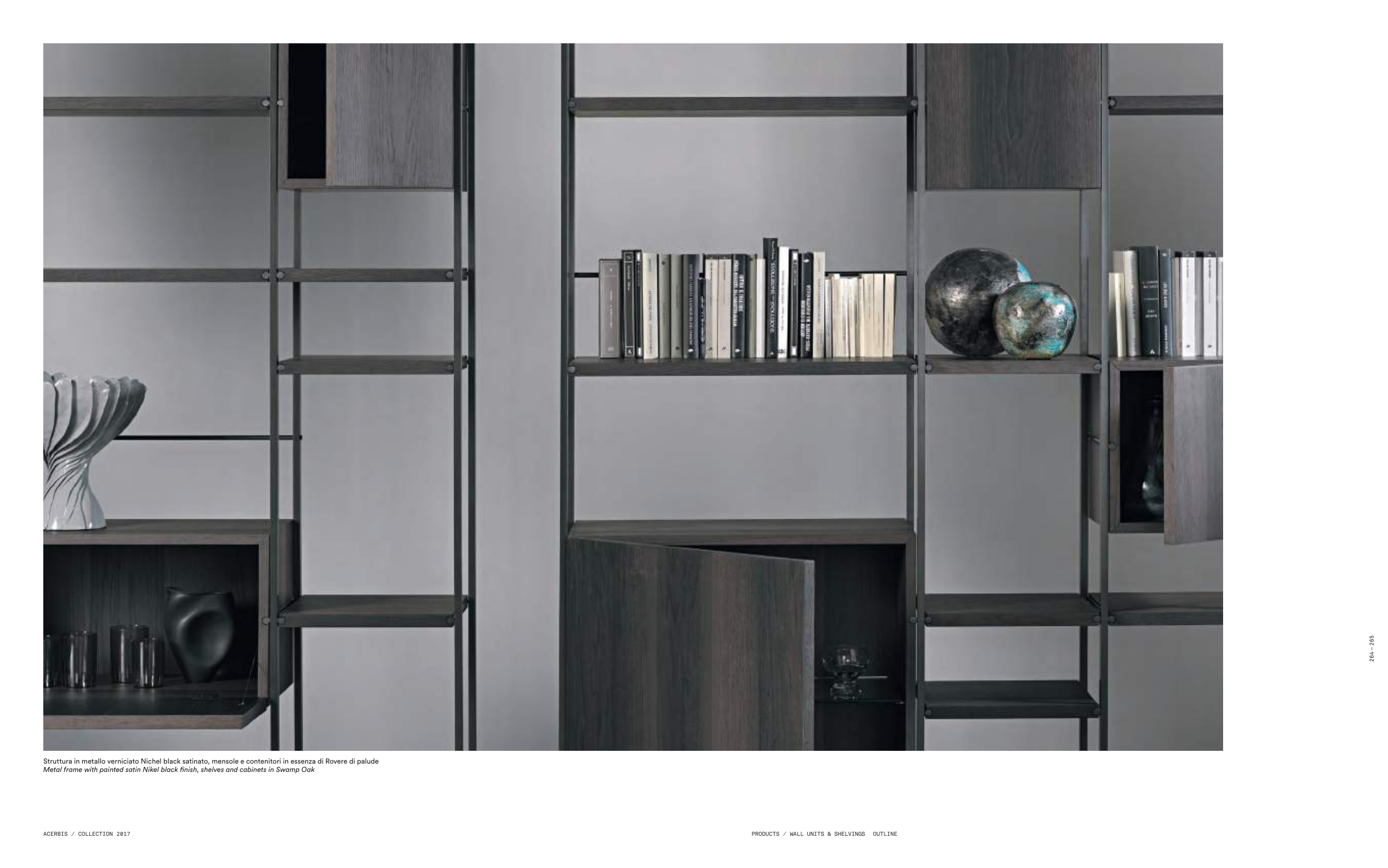 Struttura in metallo verniciato Nichel black satinato, mensole e contenitori in essenza di Rovere di palude