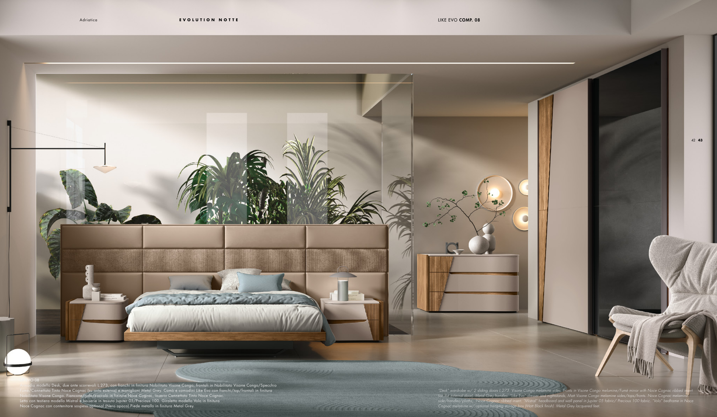 side/handles/plinths, Noce Cognac ribbed insert. “Mistral” headboard and wall panel in Jupiter 05 fabric/ Precious 100 fabric. “Volo” bedframe in Noce