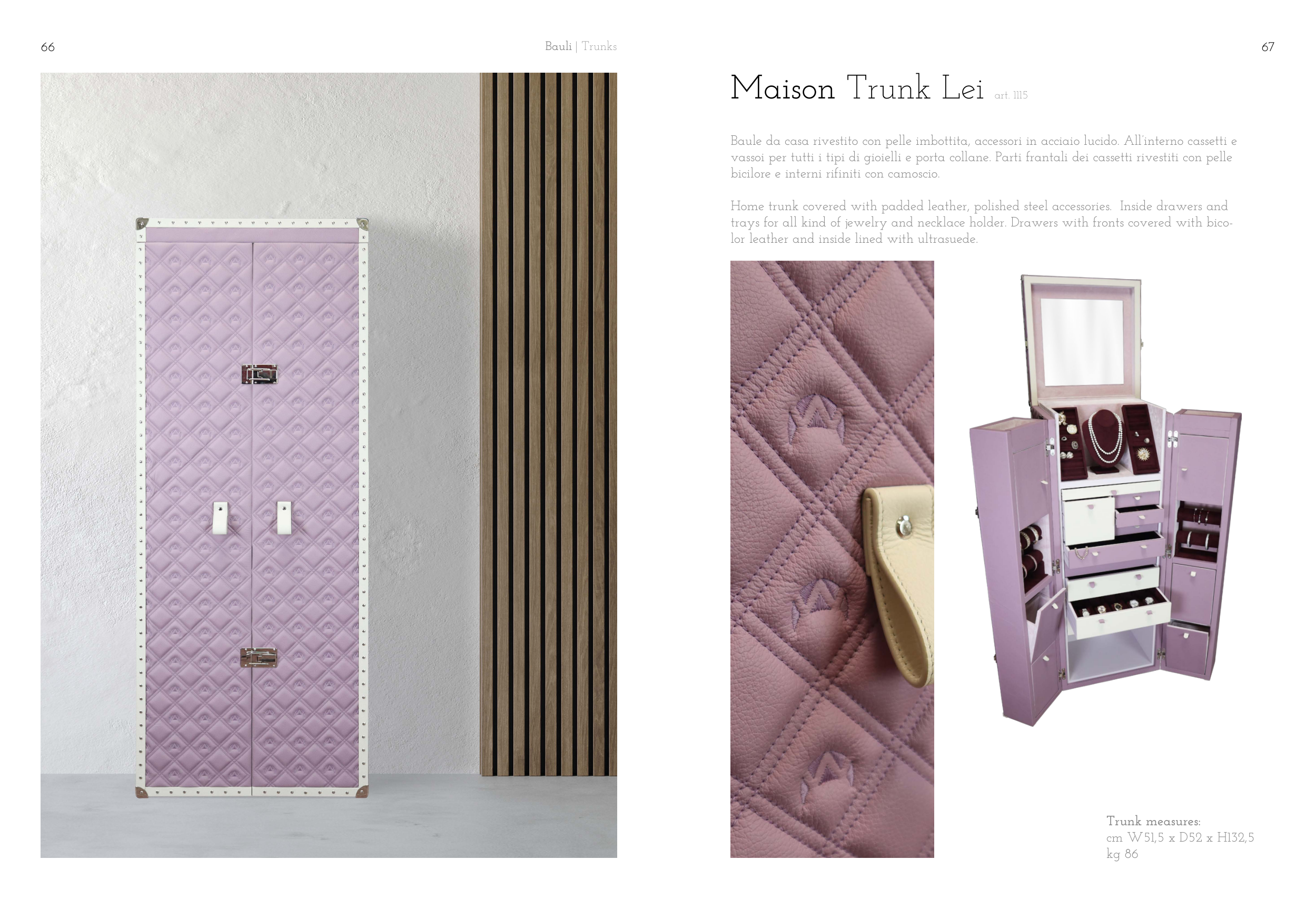 Baule da casa rivestito con pelle imbottita, accessori in acciaio lucido. All’interno cassetti e