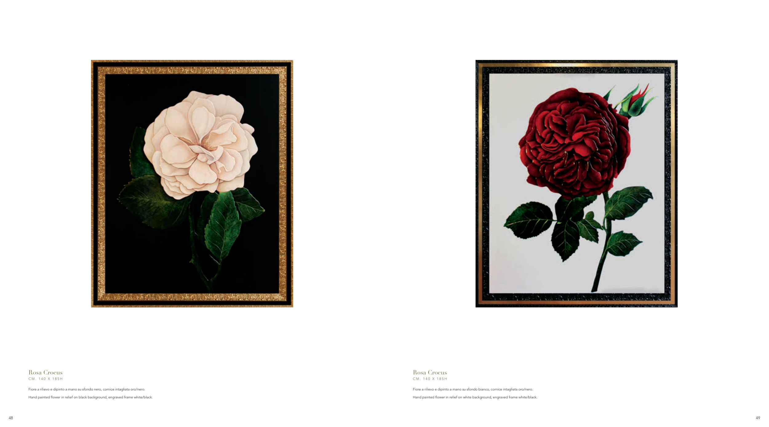 Fiore a rilievo e dipinto a mano su sfondo bianco, cornice intagliata oro/nero.