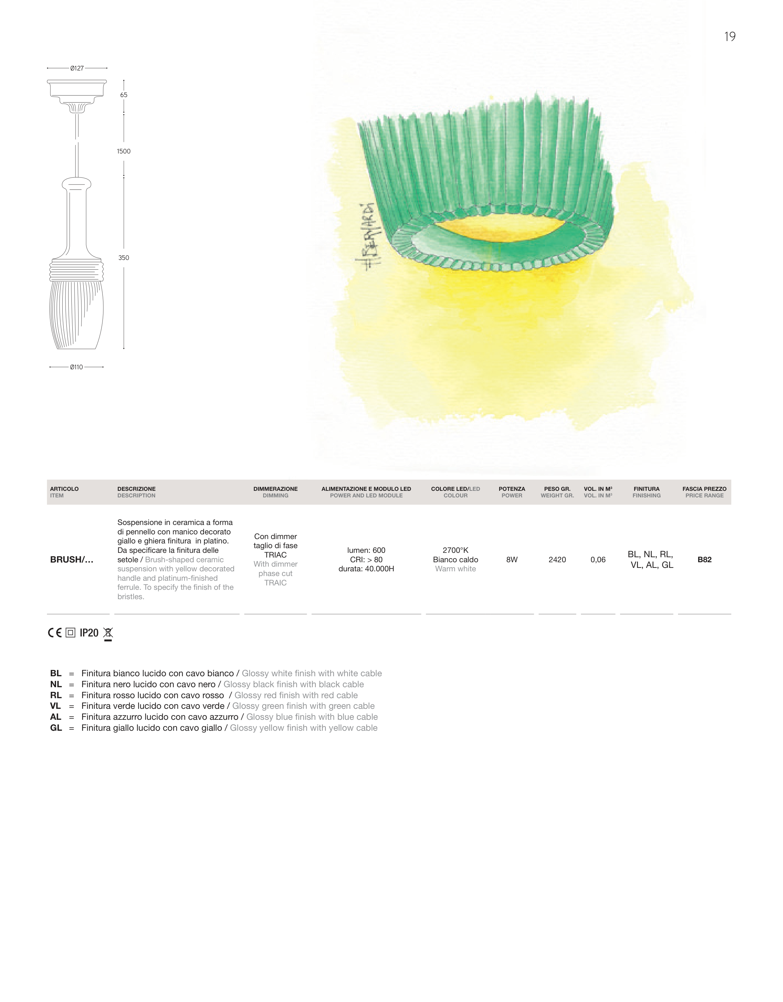 GL = Finitura giallo lucido con cavo giallo / Glossy yellow finish with yellow cable