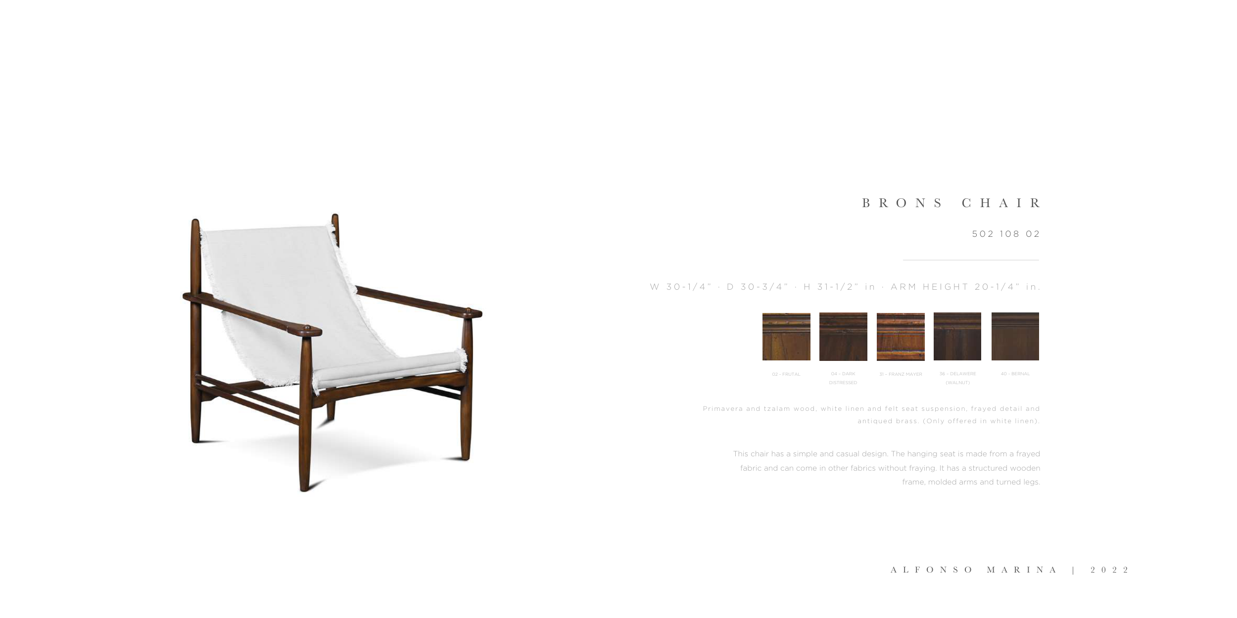 Primavera and tzalam wood, white linen and felt seat suspension, frayed detail and