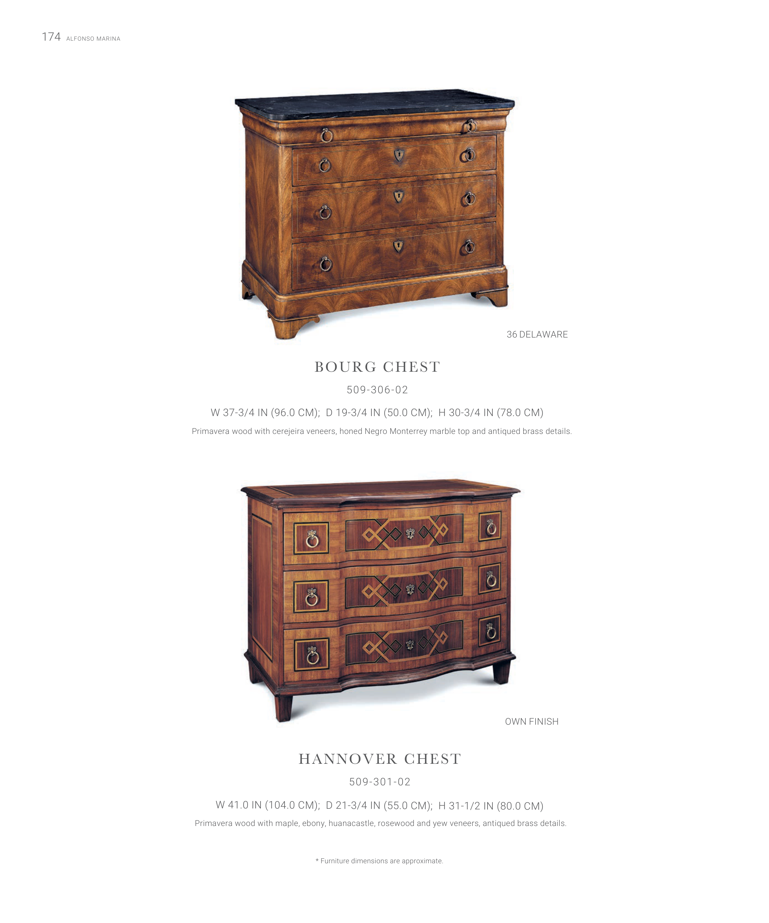 Primavera wood with maple, ebony, huanacastle, rosewood and yew veneers, antiqued brass details.