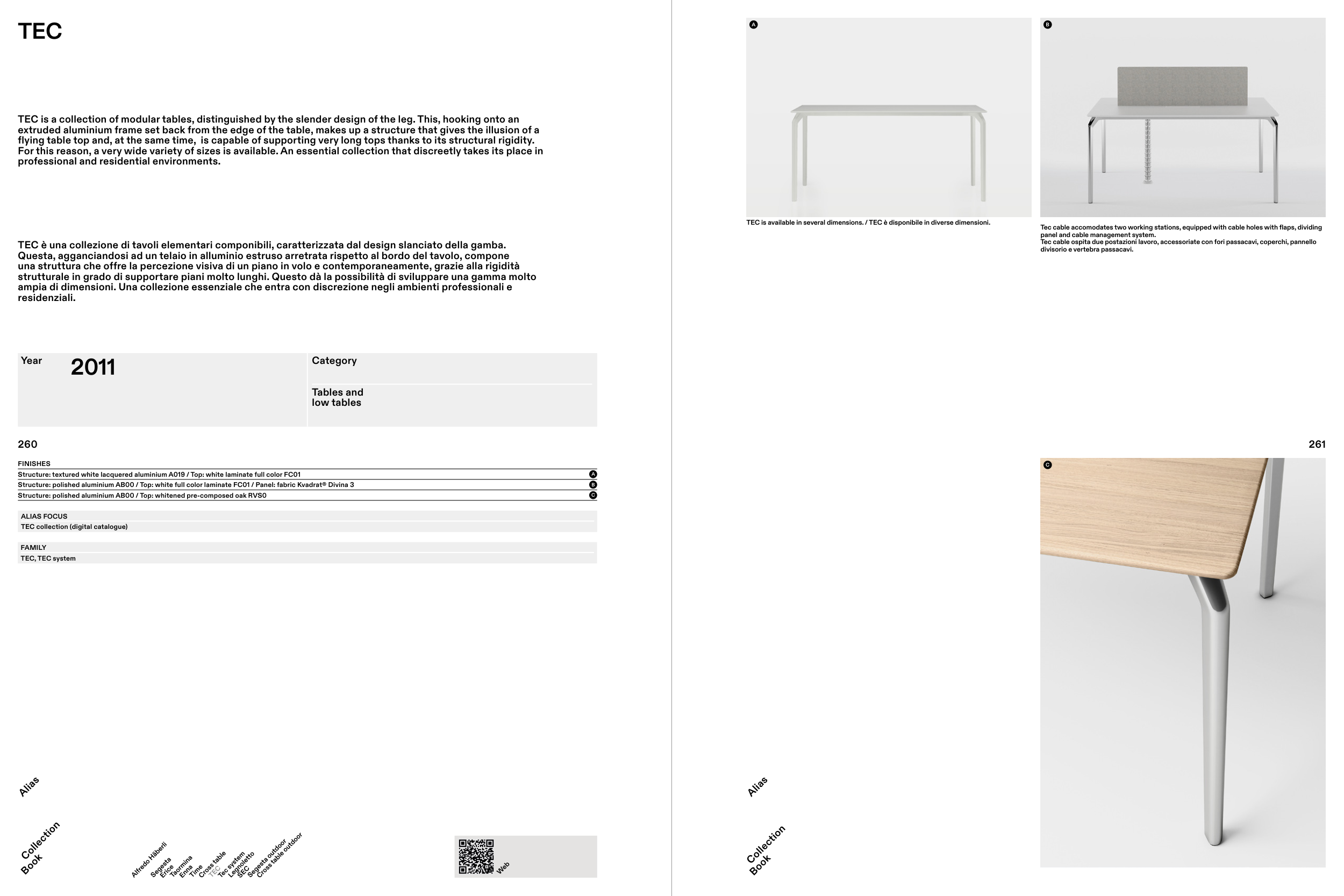 TEC is a collection of modular tables, distinguished by the slender design of the leg. This, hooking onto an