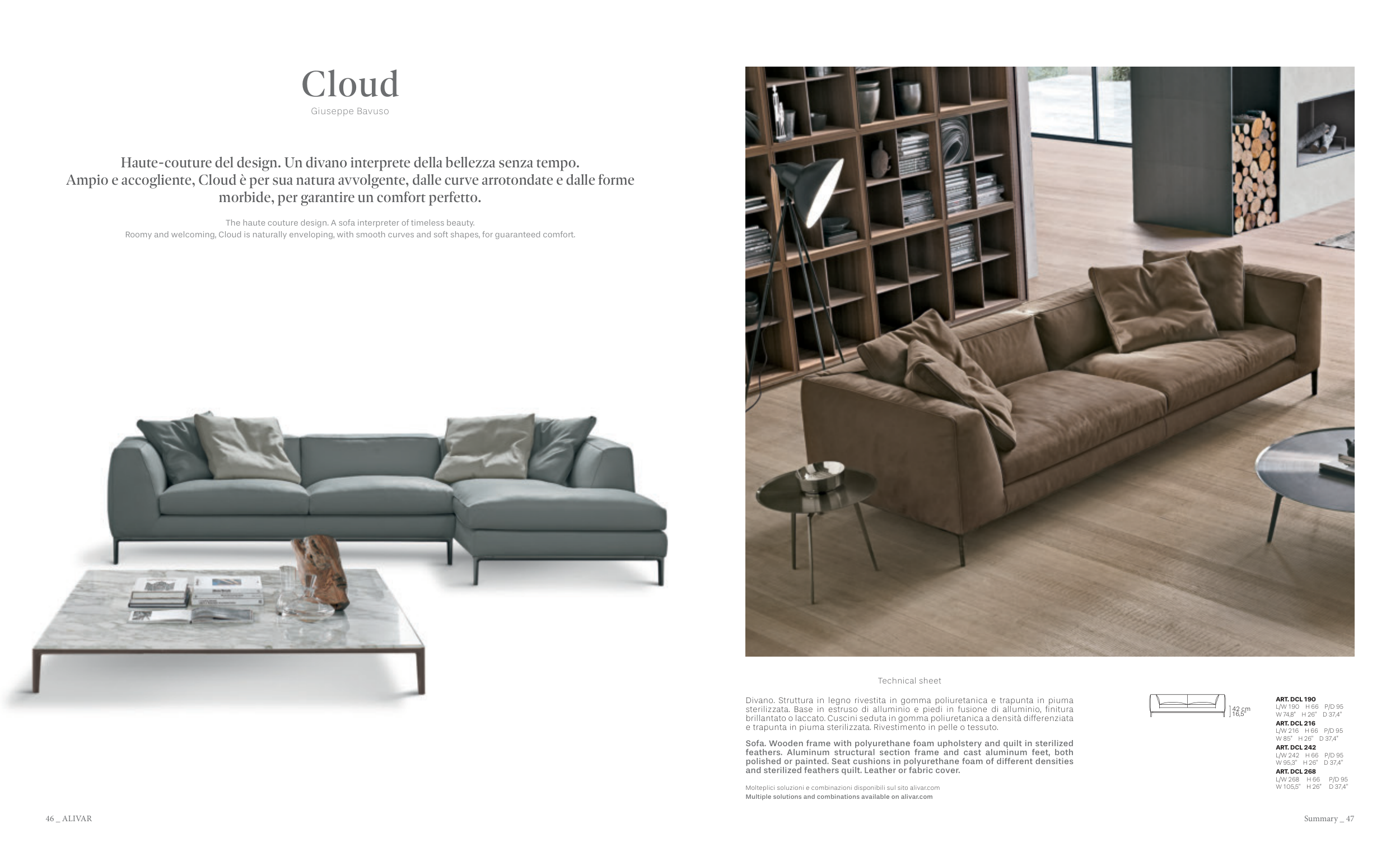 e trapunta in piuma sterilizzata. Rivestimento in pelle o tessuto.