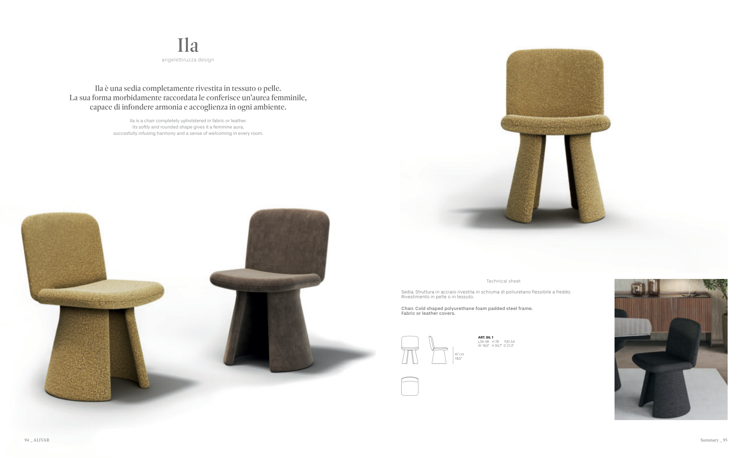 Ila is a chair completely upholstered in fabric or leather.