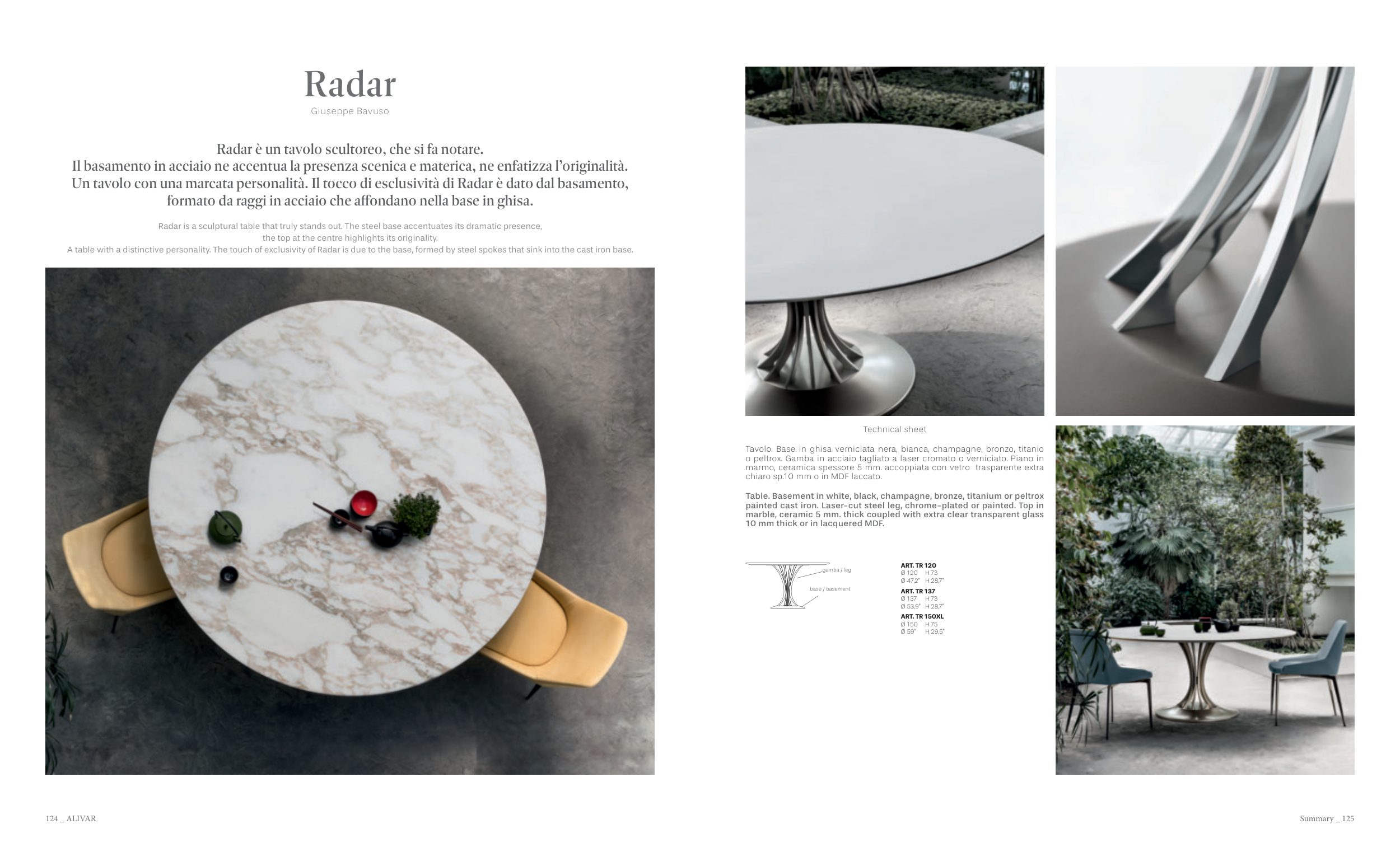 A table with a distinctive personality. The touch of exclusivity of Radar is due to the base, formed by steel spokes that sink into the cast iron base.