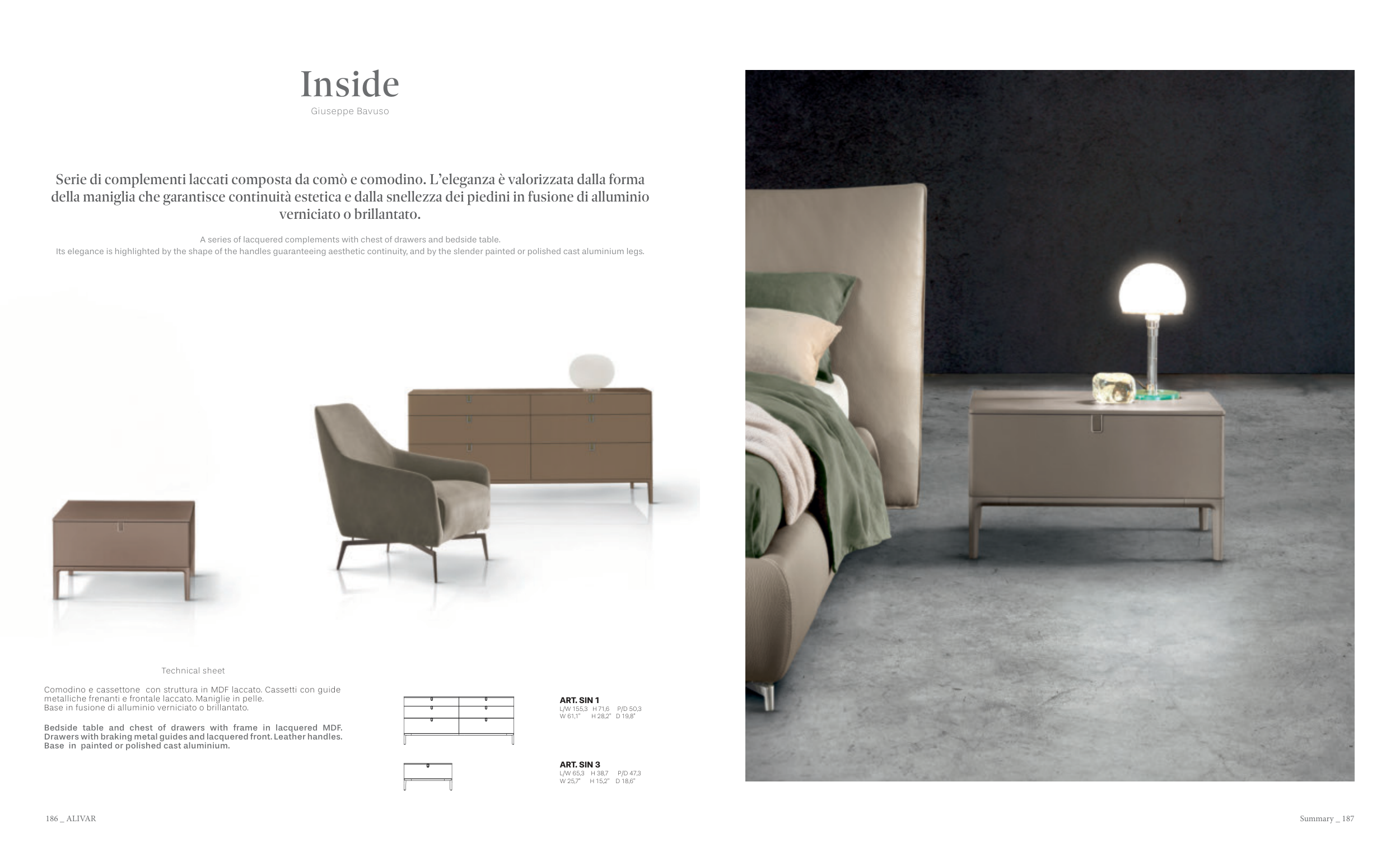 Serie di complementi laccati composta da comò e comodino. L’eleganza è valorizzata dalla forma
