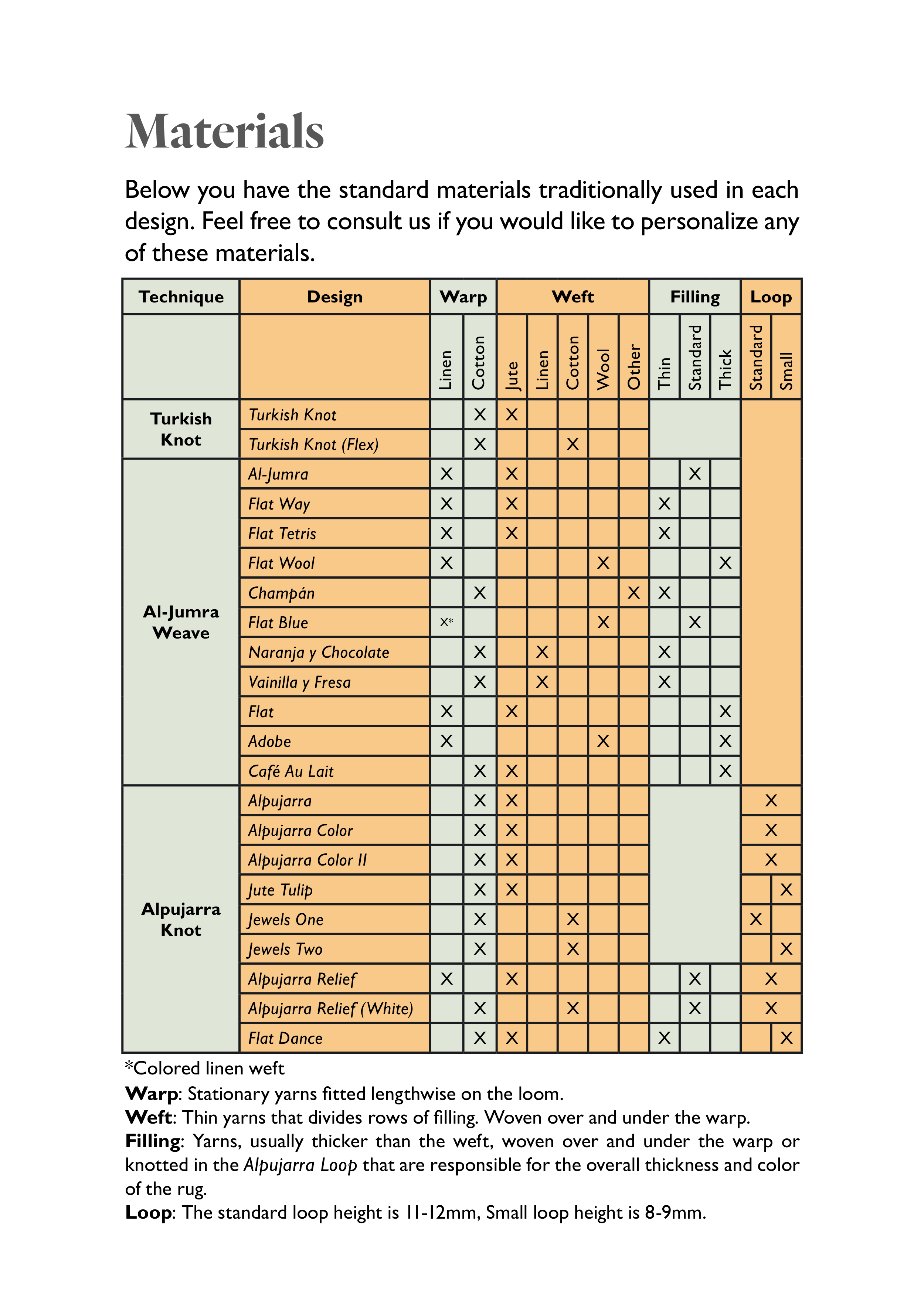 Weft: Thin yarns that divides rows of filling. Woven over and under the warp.
