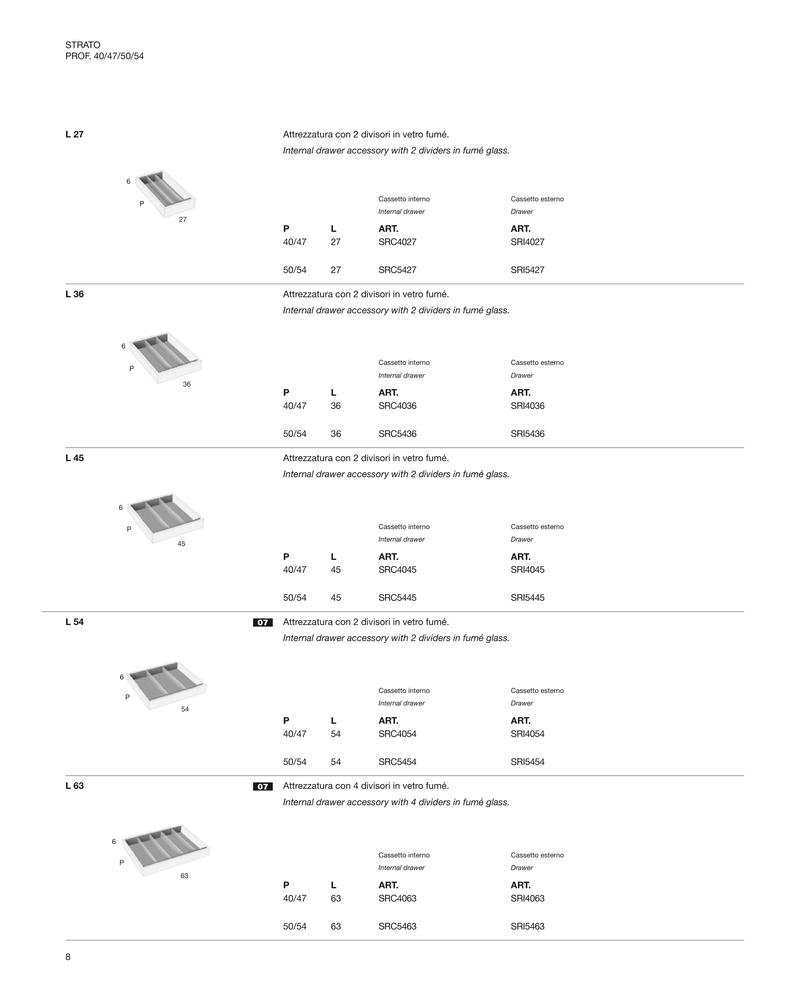 Internal drawer accessory with 4 dividers in fumé glass.