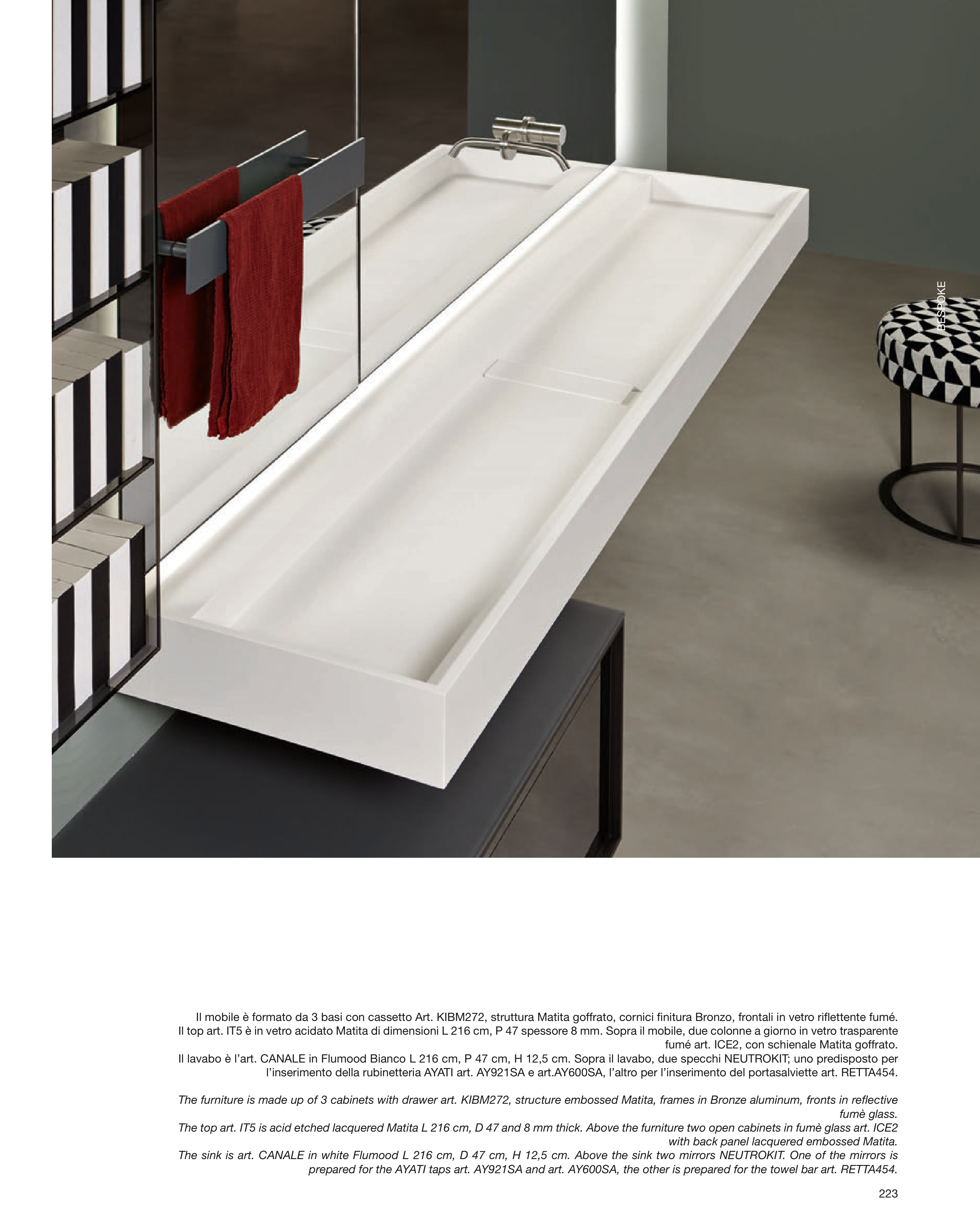 The sink is art. CANALE in white Flumood L 216 cm, D 47 cm, H 12,5 cm. Above the sink two mirrors NEUTROKIT. One of the mirrors is