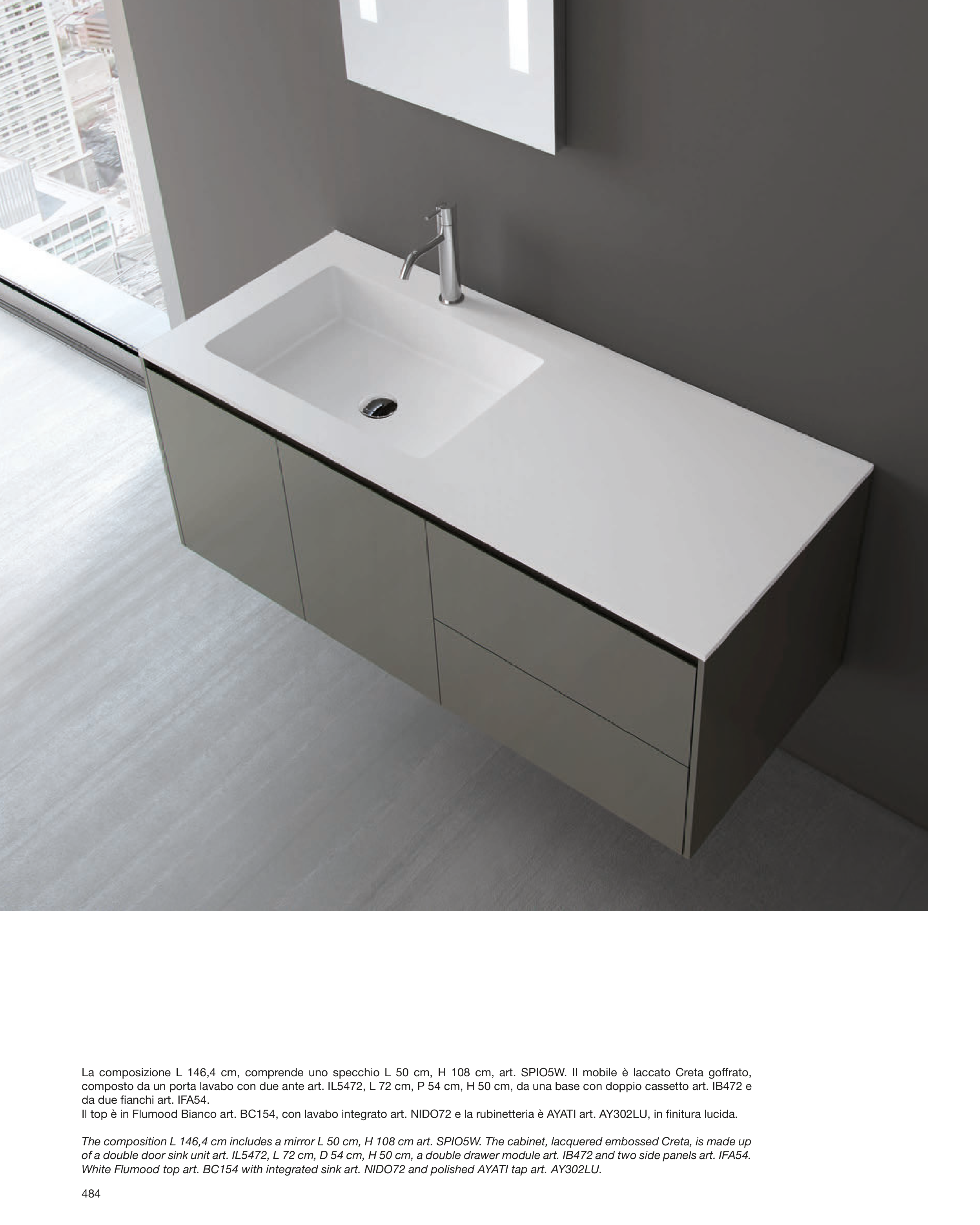 La composizione L 146,4 cm, comprende uno specchio L 50 cm, H 108 cm, art. SPIO5W. Il mobile è laccato Creta goffrato,