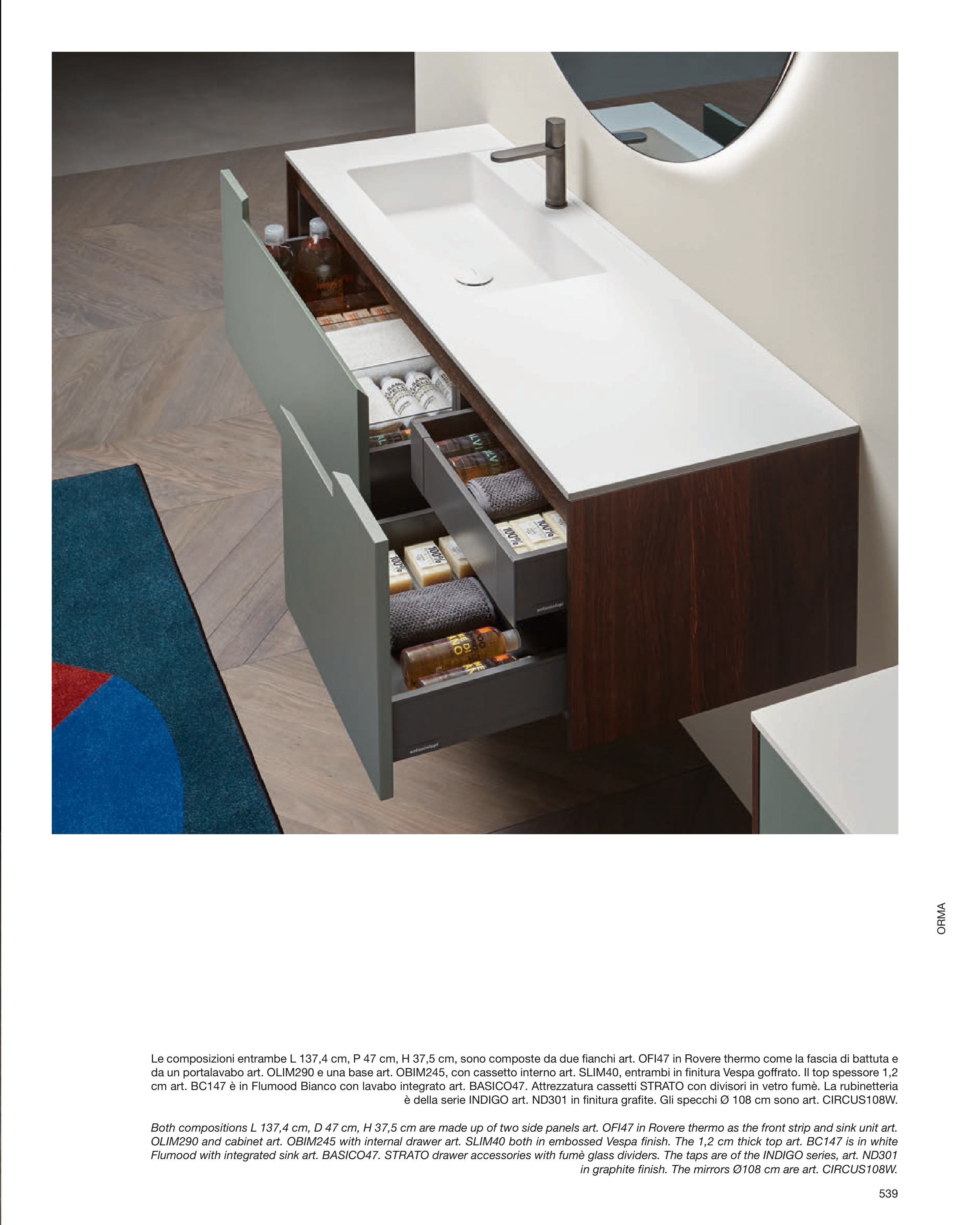 Both compositions L 137,4 cm, D 47 cm, H 37,5 cm are made up of two side panels art. OFI47 in Rovere thermo as the front strip and sink unit art.