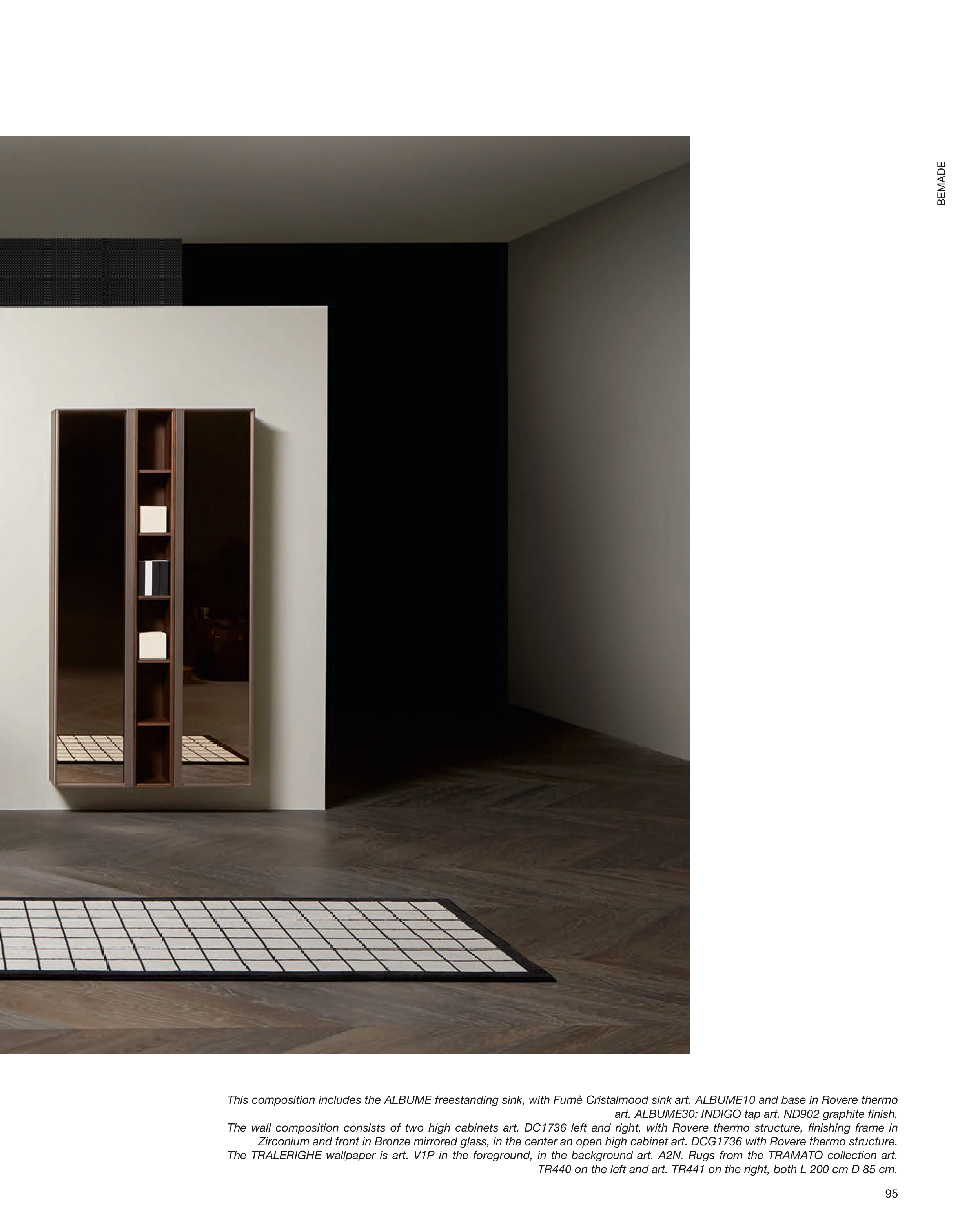 This composition includes the ALBUME freestanding sink, with Fumè Cristalmood sink art. ALBUME10 and base in Rovere thermo