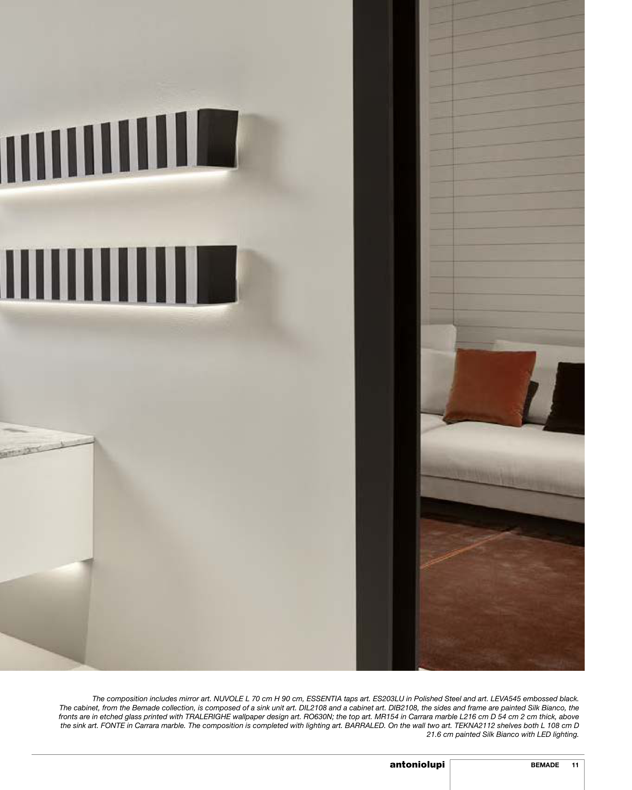the sink art. FONTE in Carrara marble. The composition is completed with lighting art. BARRALED. On the wall two art. TEKNA2112 shelves both L 108 cm D