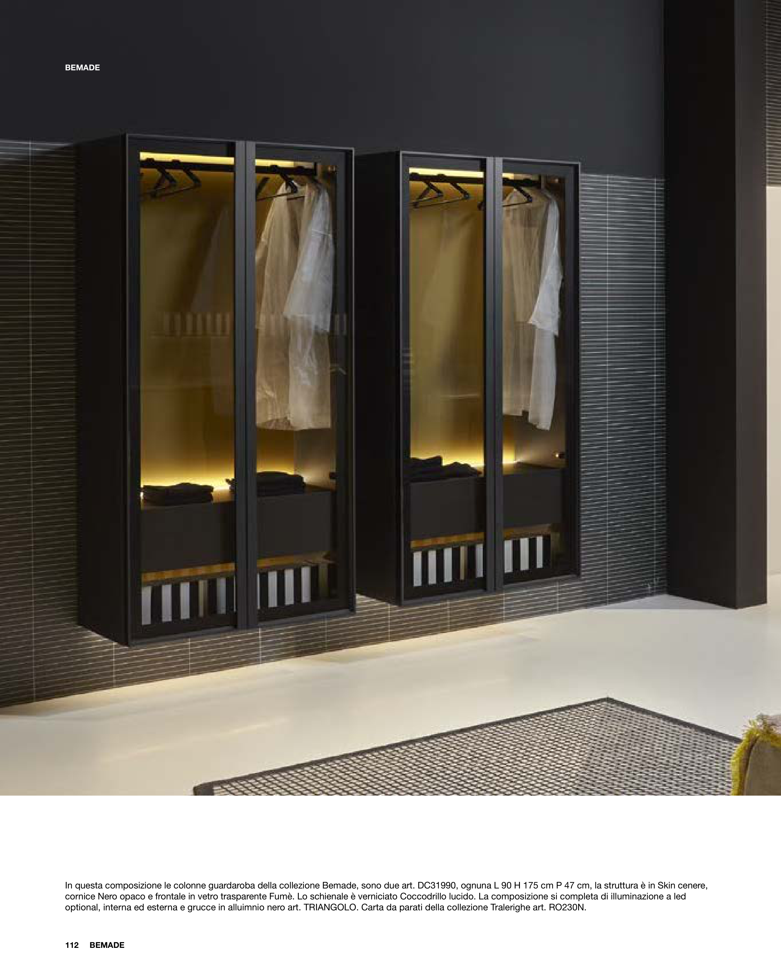 In questa composizione le colonne guardaroba della collezione Bemade, sono due art. DC31990, ognuna L 90 H 175 cm P 47 cm, la struttura è in Skin cenere,