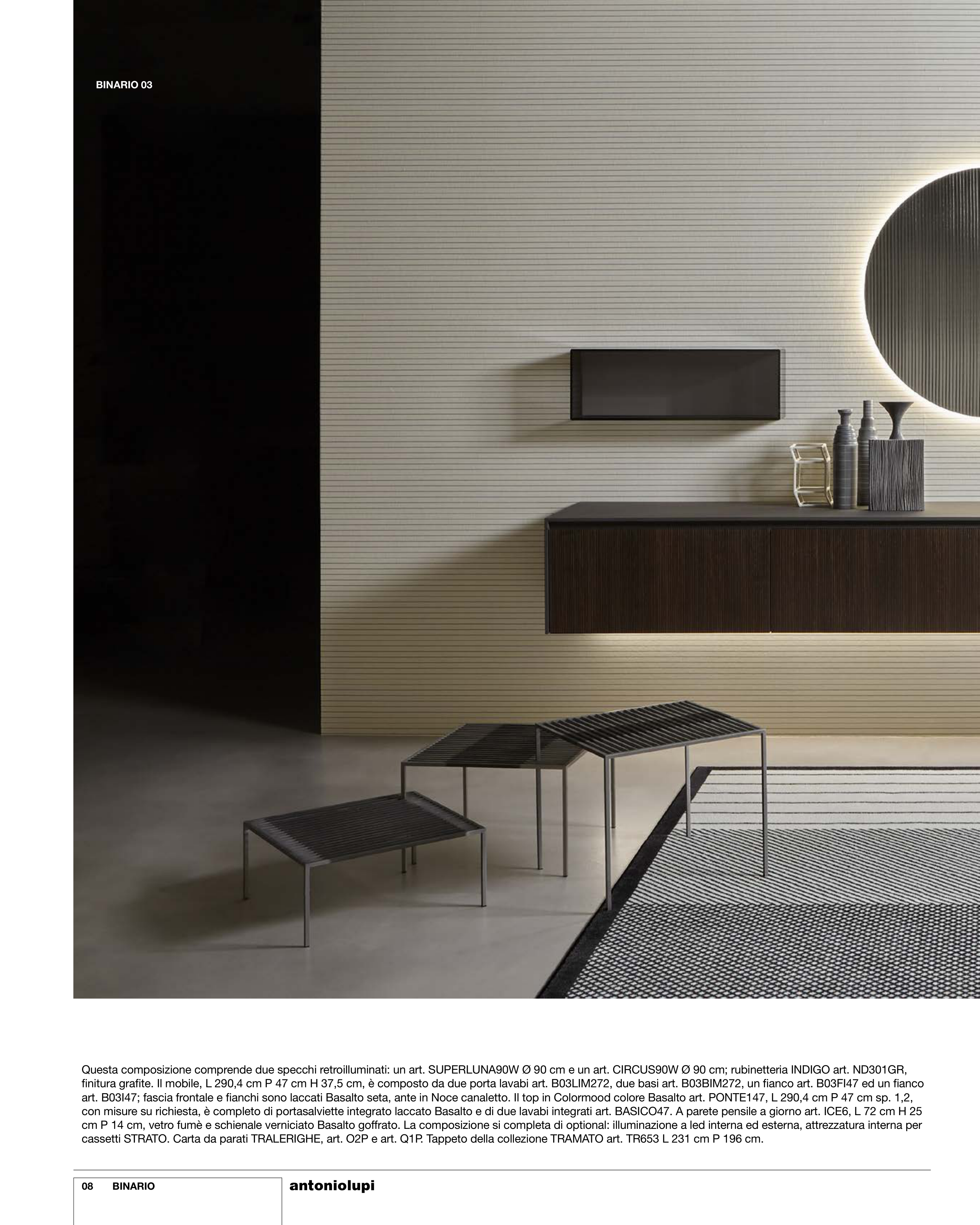 finitura grafite. Il mobile, L 290,4 cm P 47 cm H 37,5 cm, è composto da due porta lavabi art. B03LIM272, due basi art. B03BIM272, un fianco art. B03FI47 ed un fianco