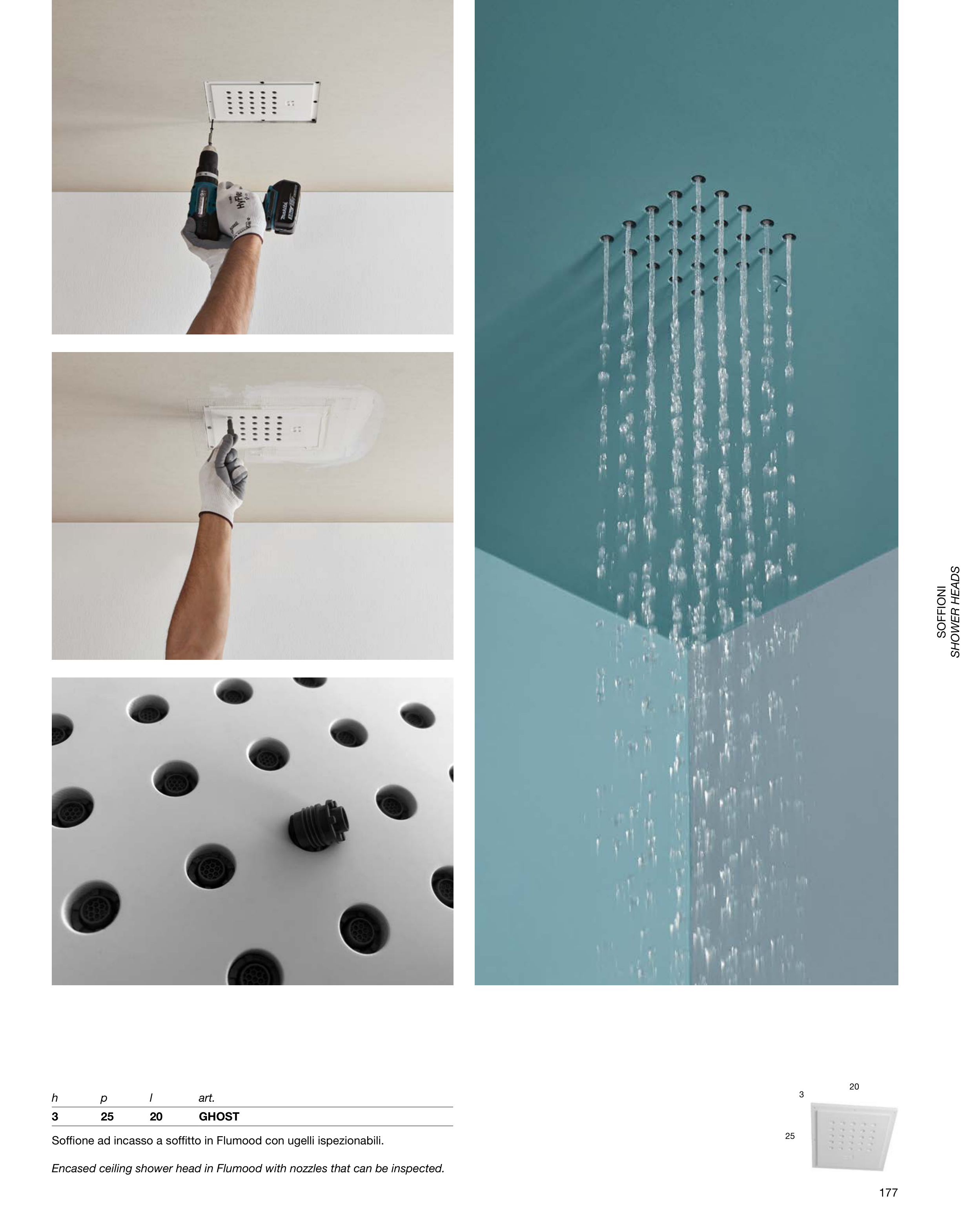 Soffione ad incasso a soffitto in Flumood con ugelli ispezionabili.