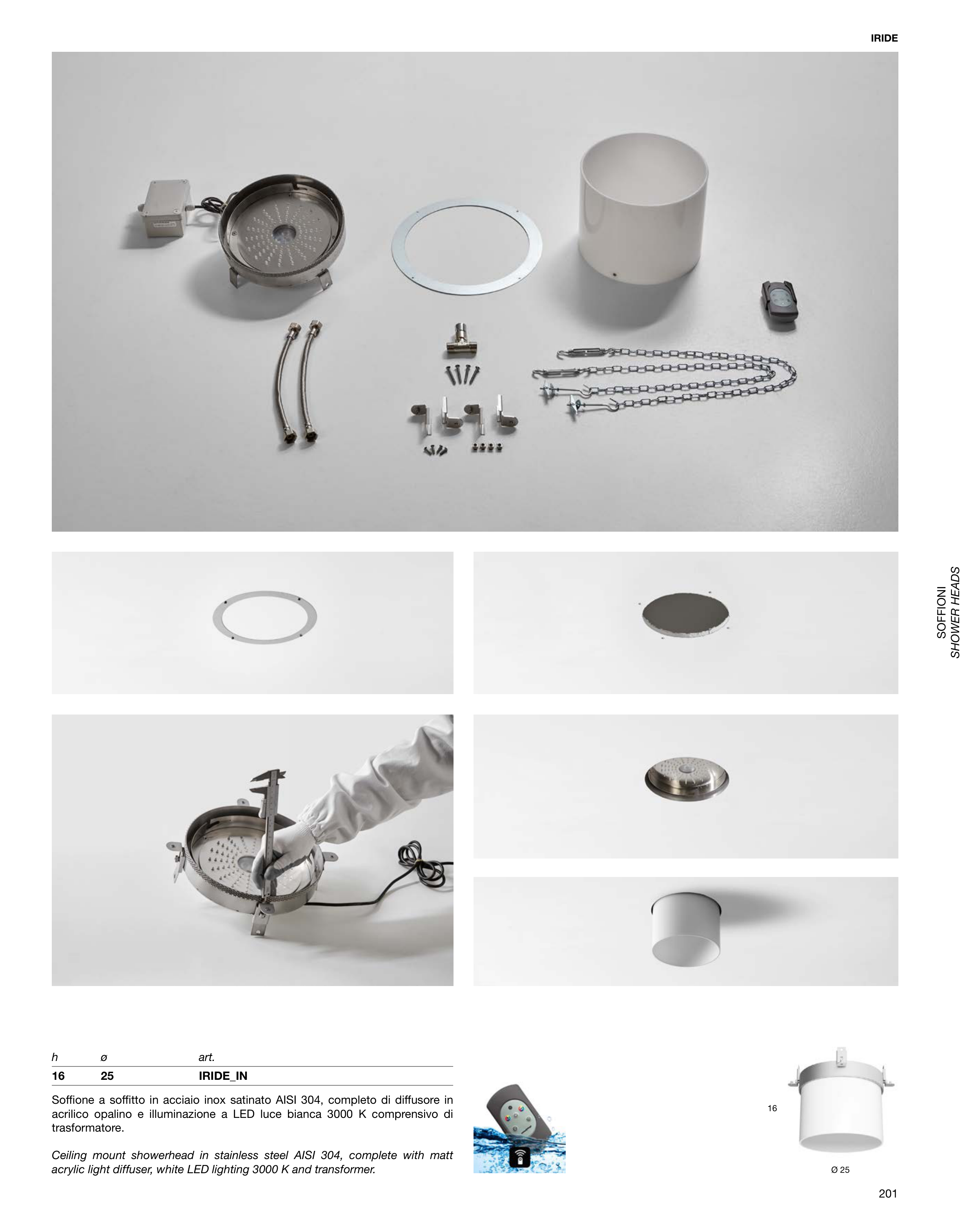 Soffione a soffitto in acciaio inox satinato AISI 304, completo di diffusore in
