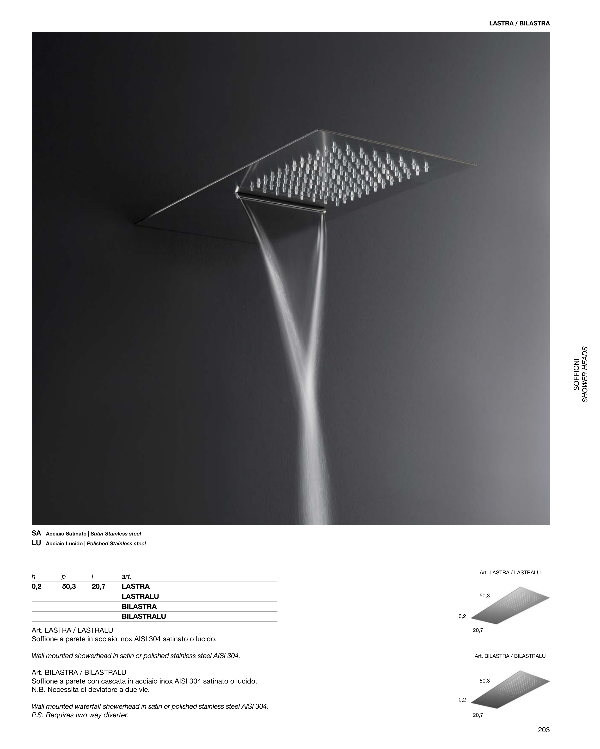 Soffione a parete con cascata in acciaio inox AISI 304 satinato o lucido.