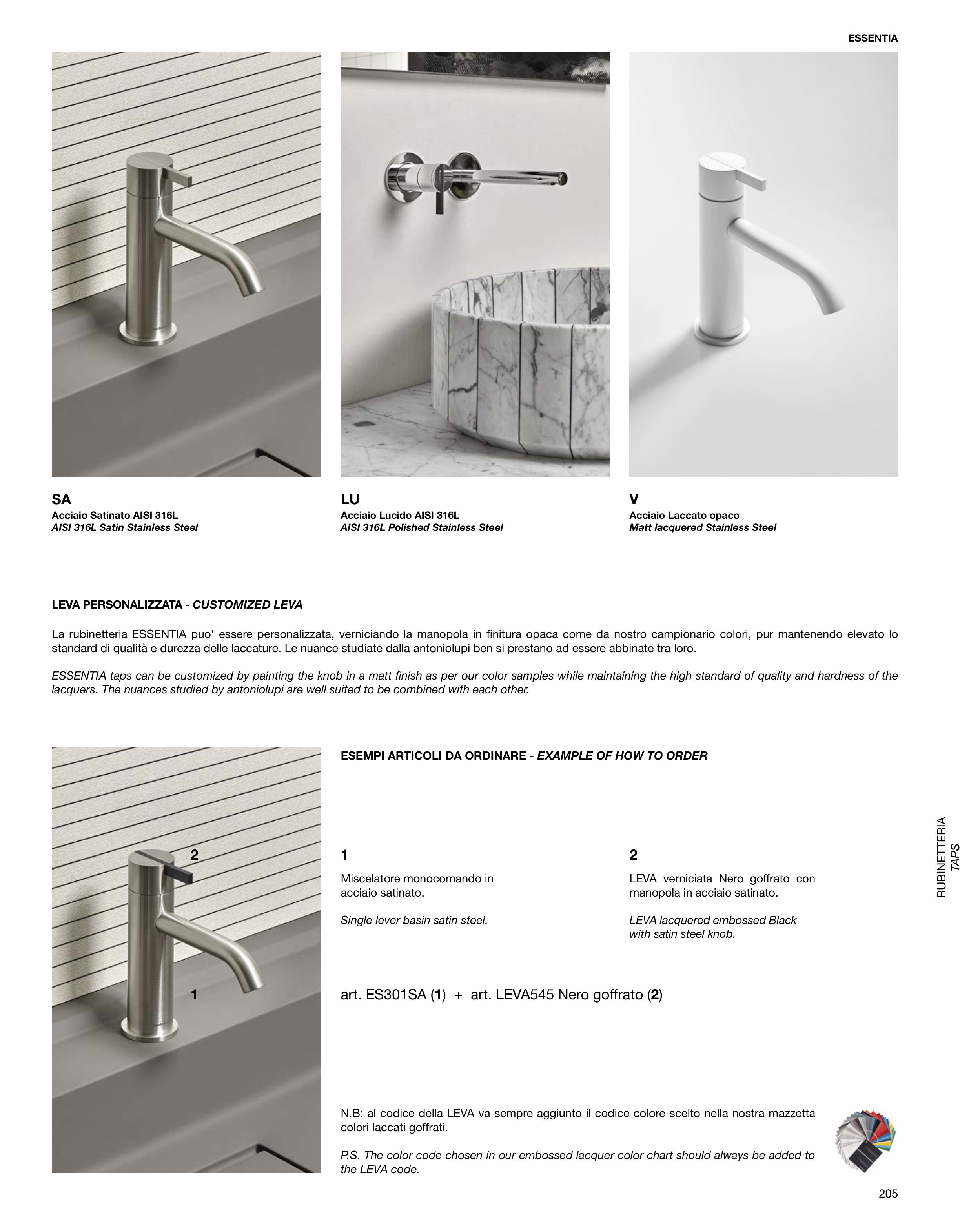 La rubinetteria ESSENTIA puo' essere personalizzata, verniciando la manopola in fi nitura opaca come da nostro campionario colori, pur mantenendo elevato lo