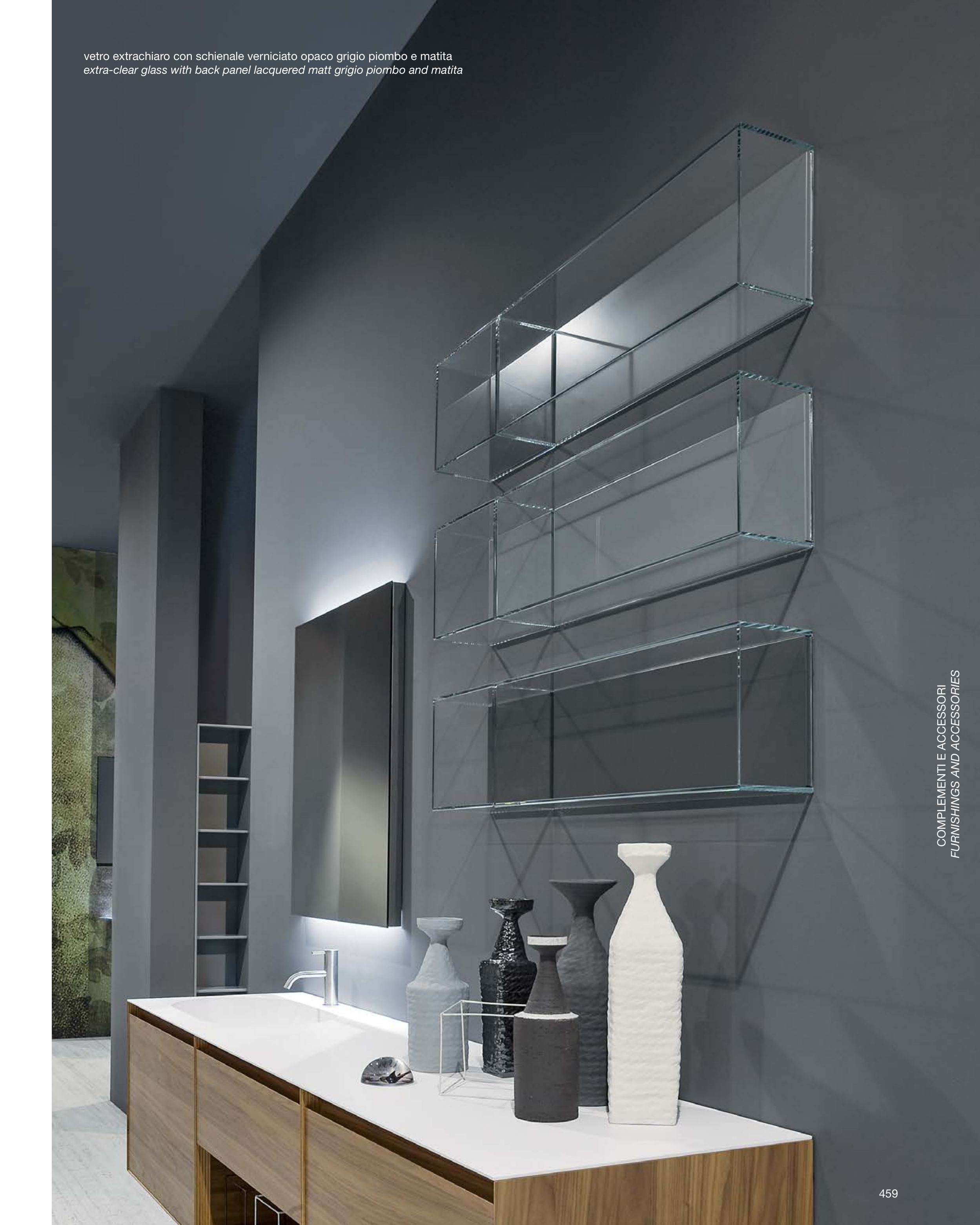 extra-clear glass with back panel lacquered matt grigio piombo and matita
