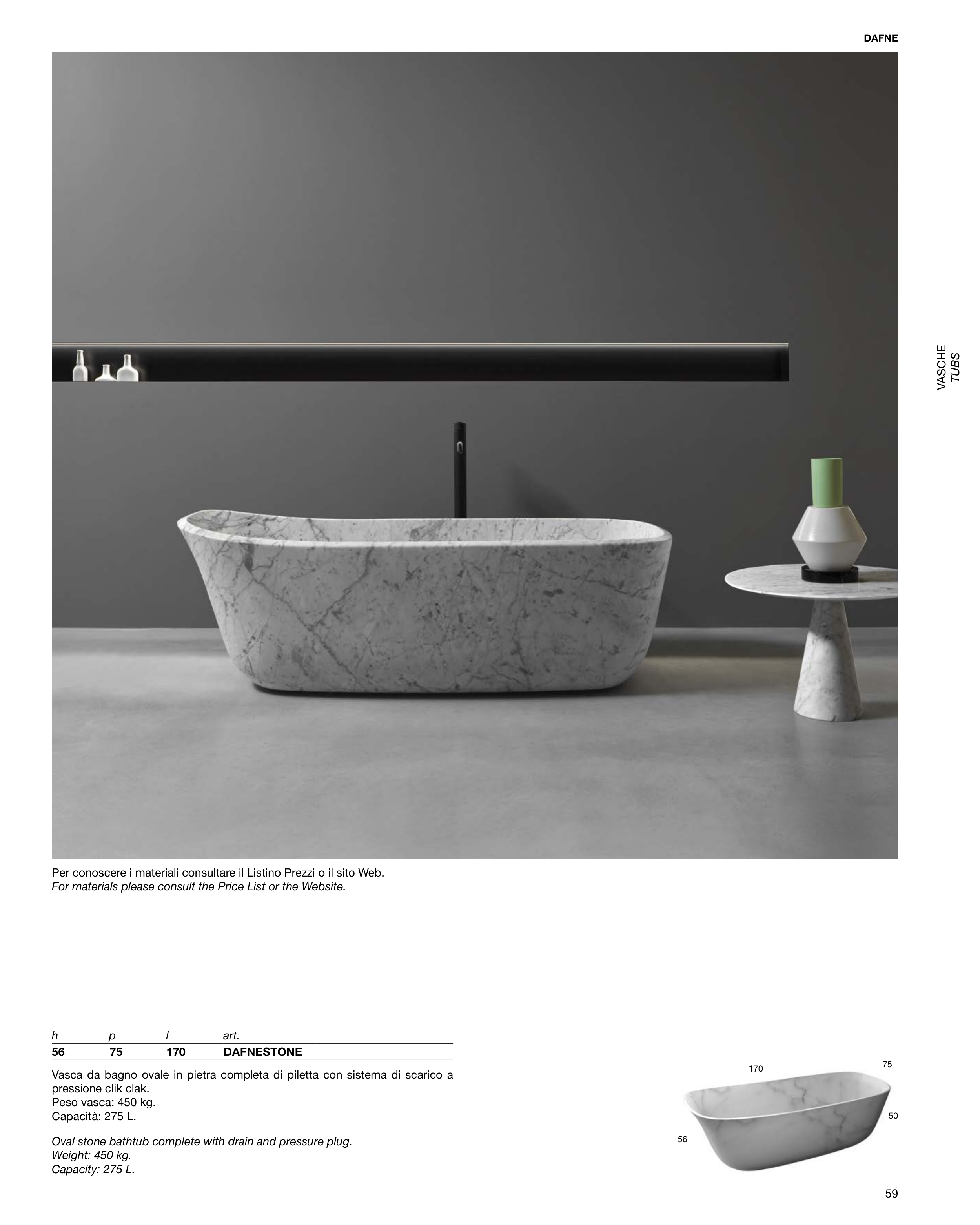 Vasca da bagno ovale in pietra completa di piletta con sistema di scarico a