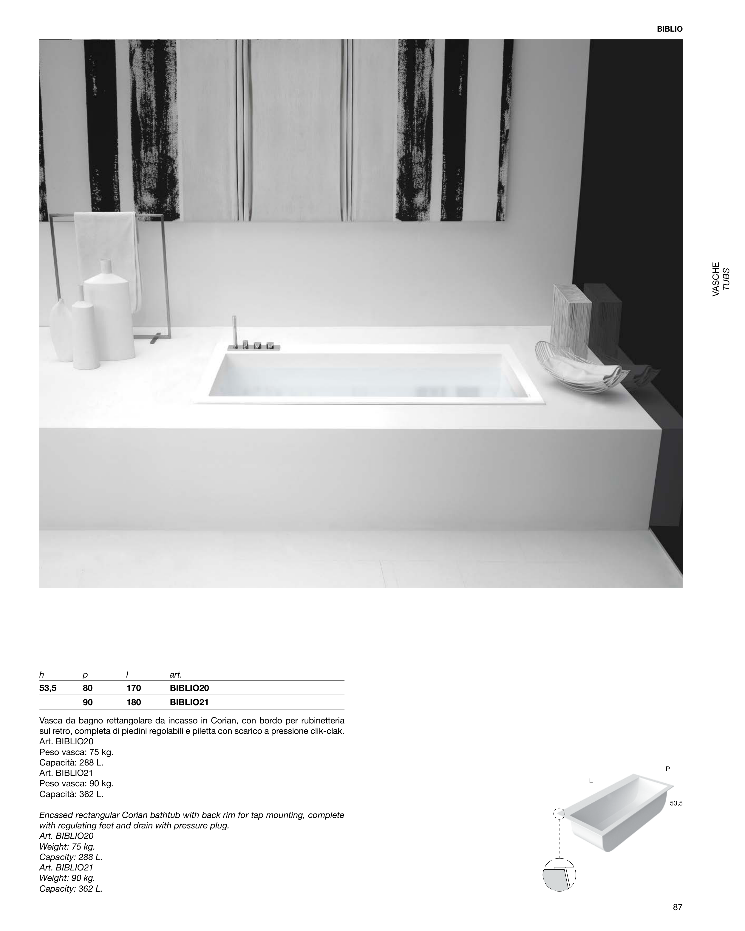 Vasca da bagno rettangolare da incasso in Corian, con bordo per rubinetteria