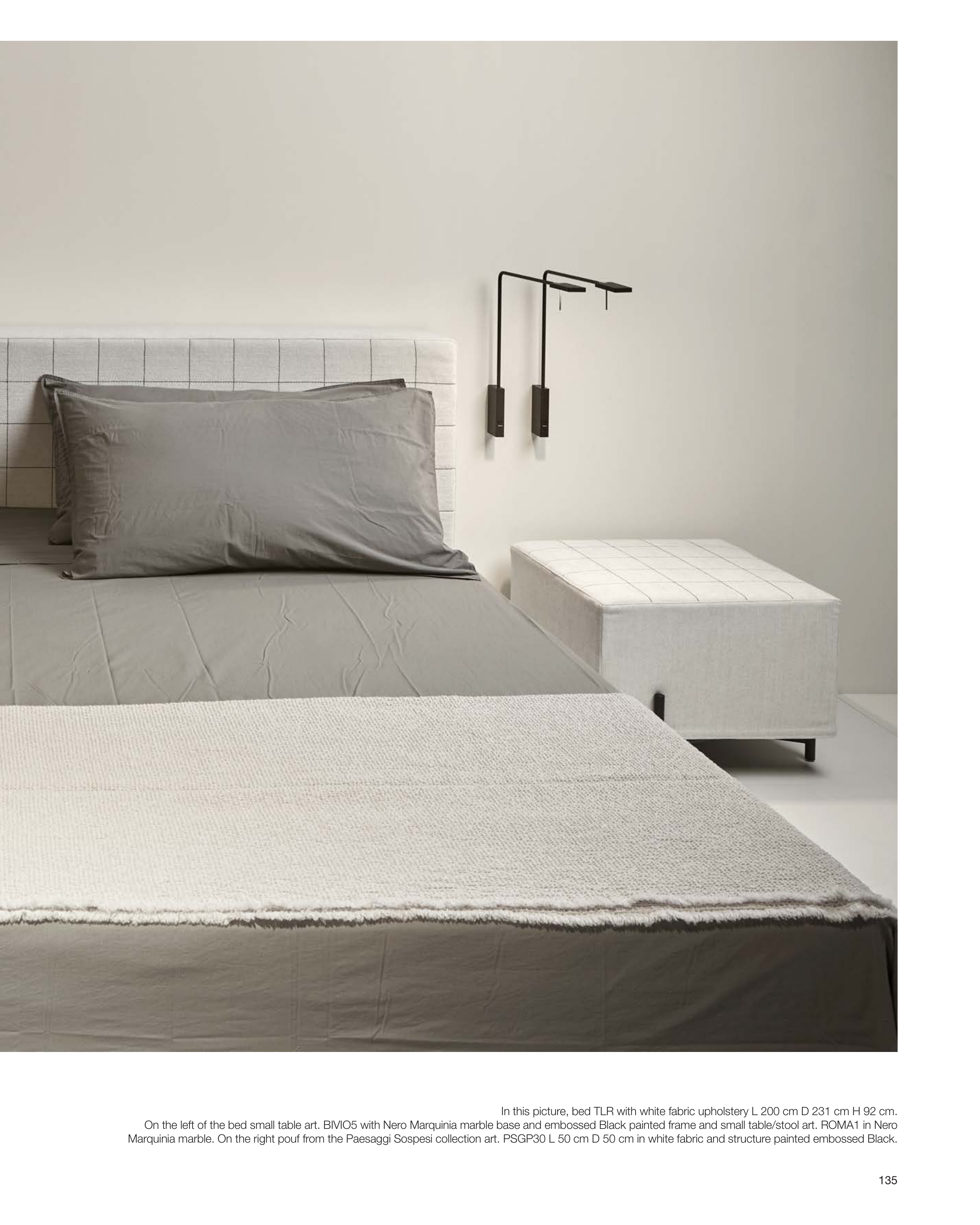 On the left of the bed small table art. BIVIO5 with Nero Marquinia marble base and embossed Black painted frame and small table/stool art. ROMA1 in Nero