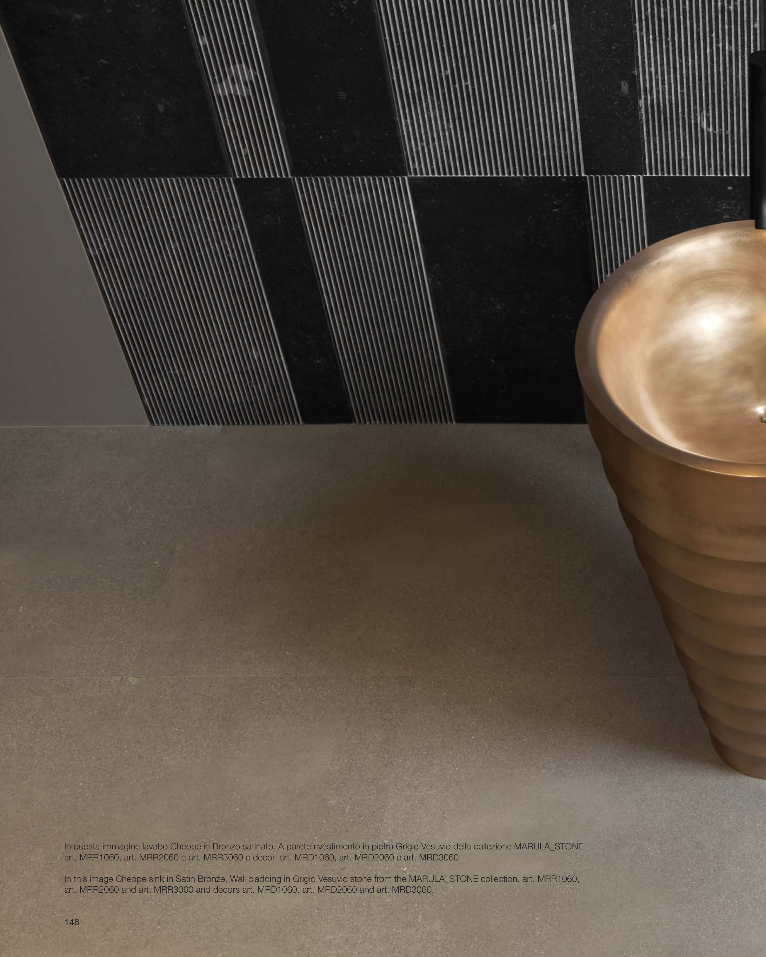 In this image Cheope sink in Satin Bronze. Wall cladding in Grigio Vesuvio stone from the MARULA_STONE collection. art. MRR1060,