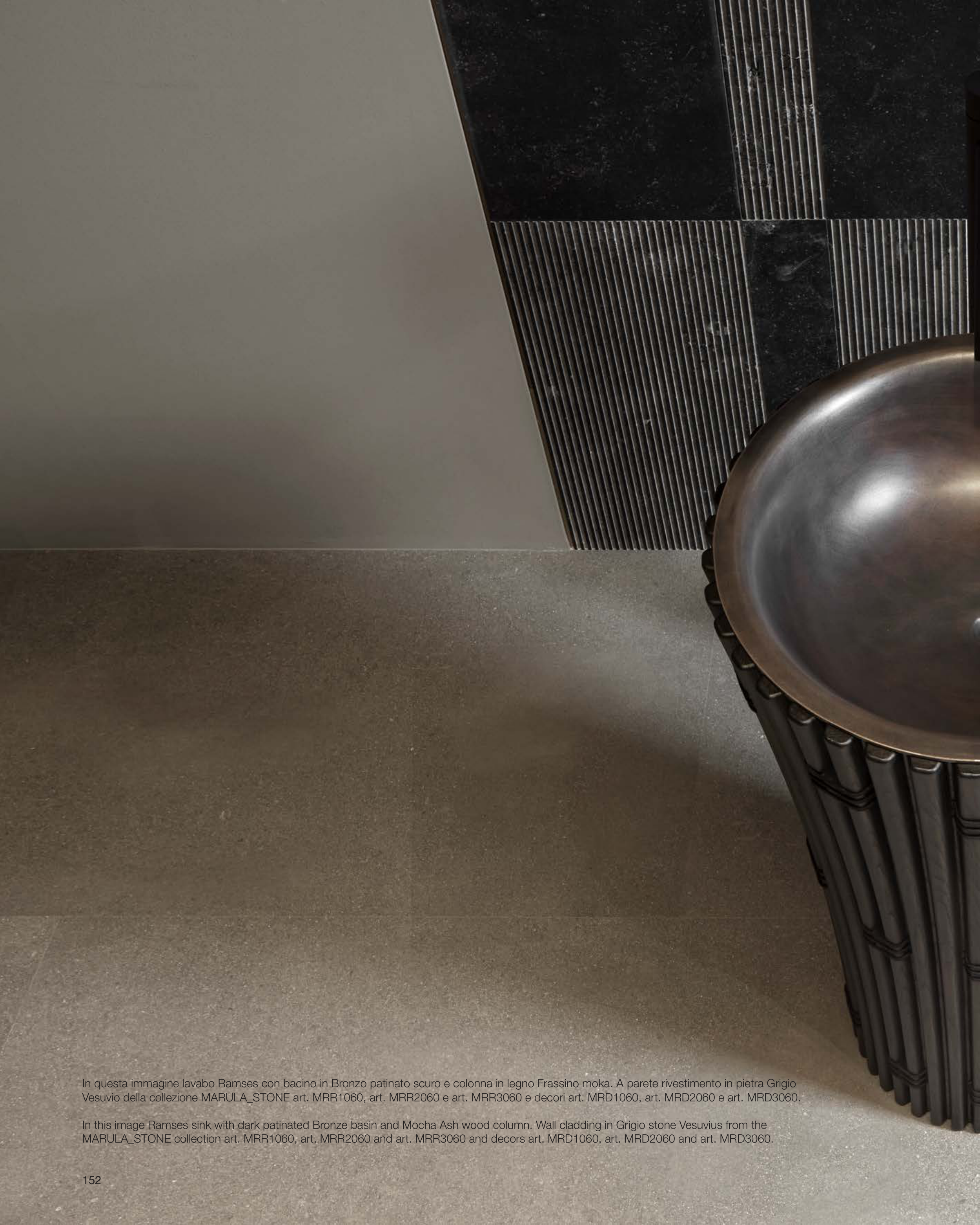 In this image Ramses sink with dark patinated Bronze basin and Mocha Ash wood column. Wall cladding in Grigio stone Vesuvius from the