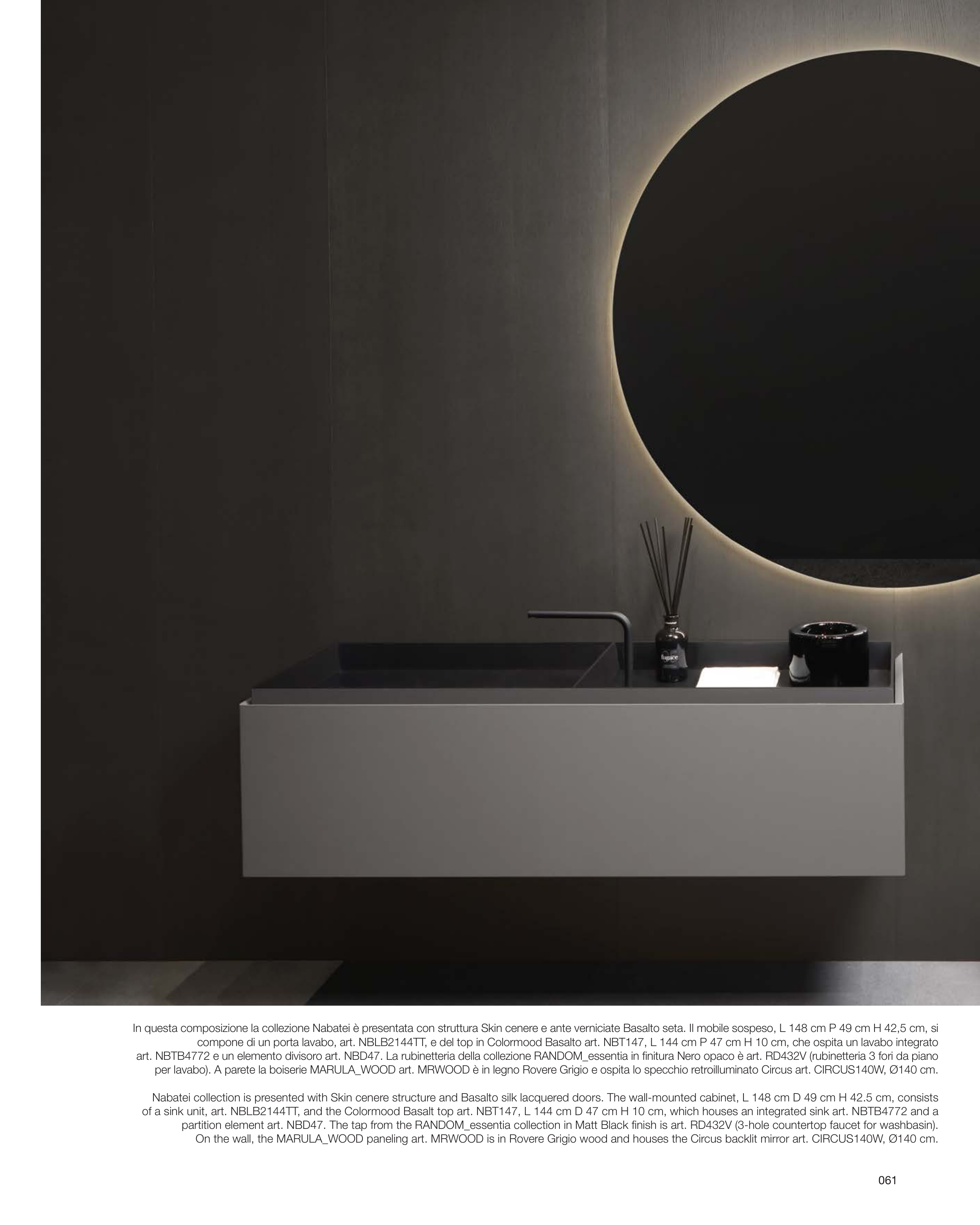 per lavabo). A parete la boiserie MARULA_WOOD art. MRWOOD è in legno Rovere Grigio e ospita lo specchio retroilluminato Circus art. CIRCUS140W, Ø140 cm.
