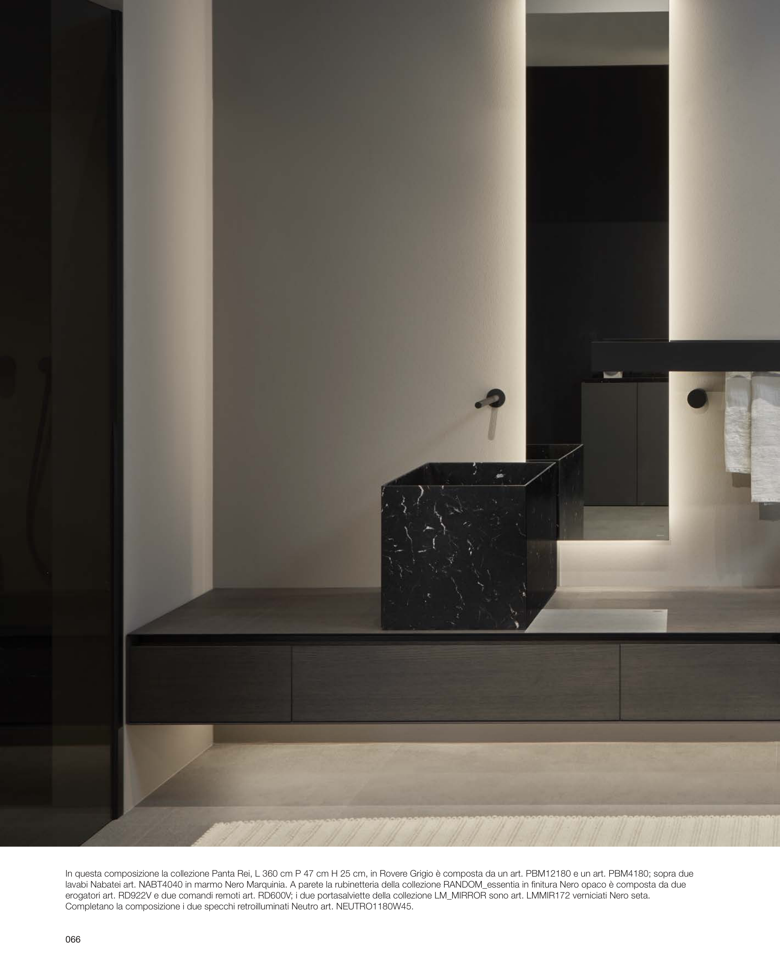 lavabi Nabatei art. NABT4040 in marmo Nero Marquinia. A parete la rubinetteria della collezione RANDOM_essentia in finitura Nero opaco è composta da due
