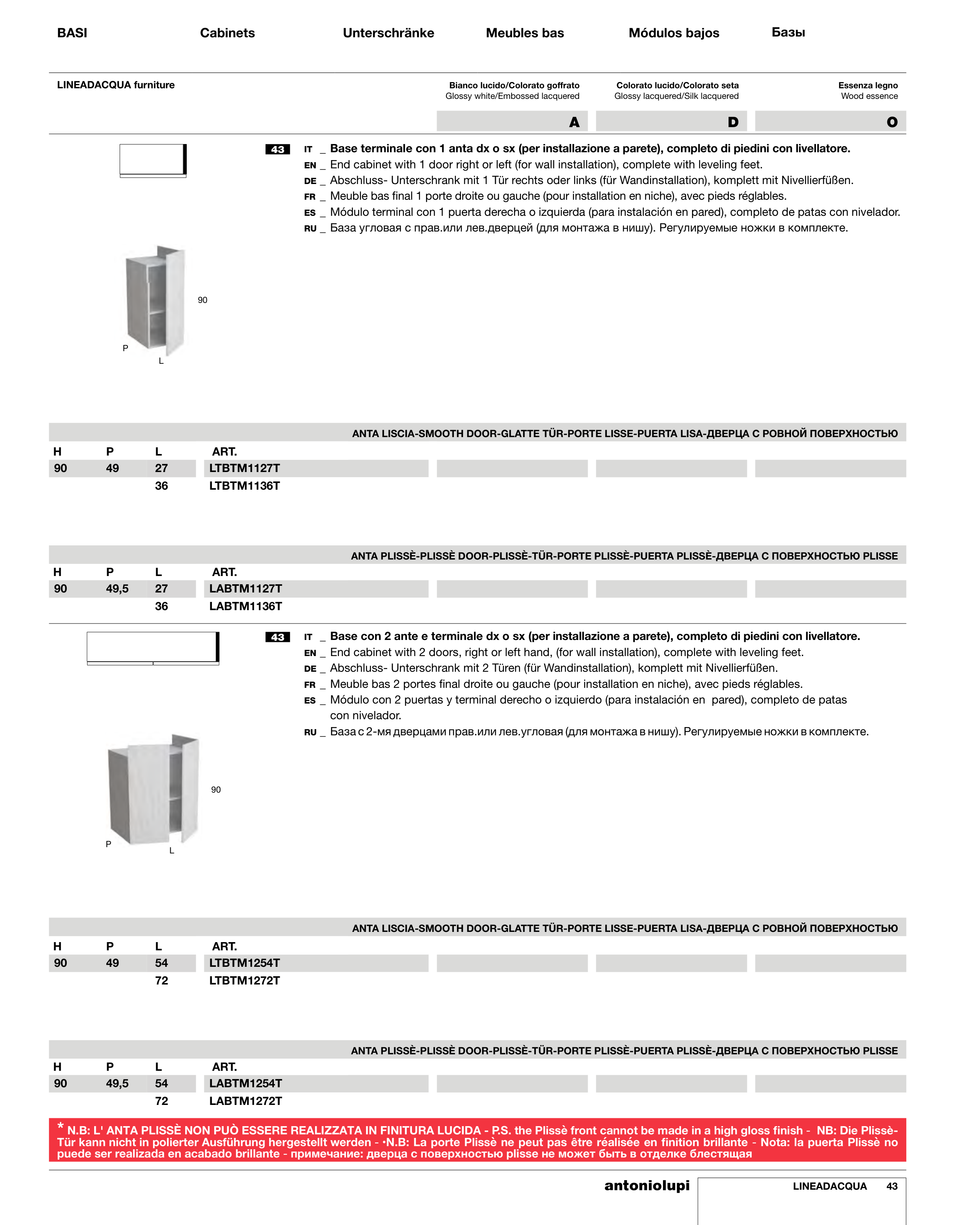 * N.B: L' ANTA PLISSÈ NON PUÒ ESSERE REALIZZATA IN FINITURA LUCIDA - P.S. the Plissè front cannot be made in a high gloss finish - NB: Die Plissè-