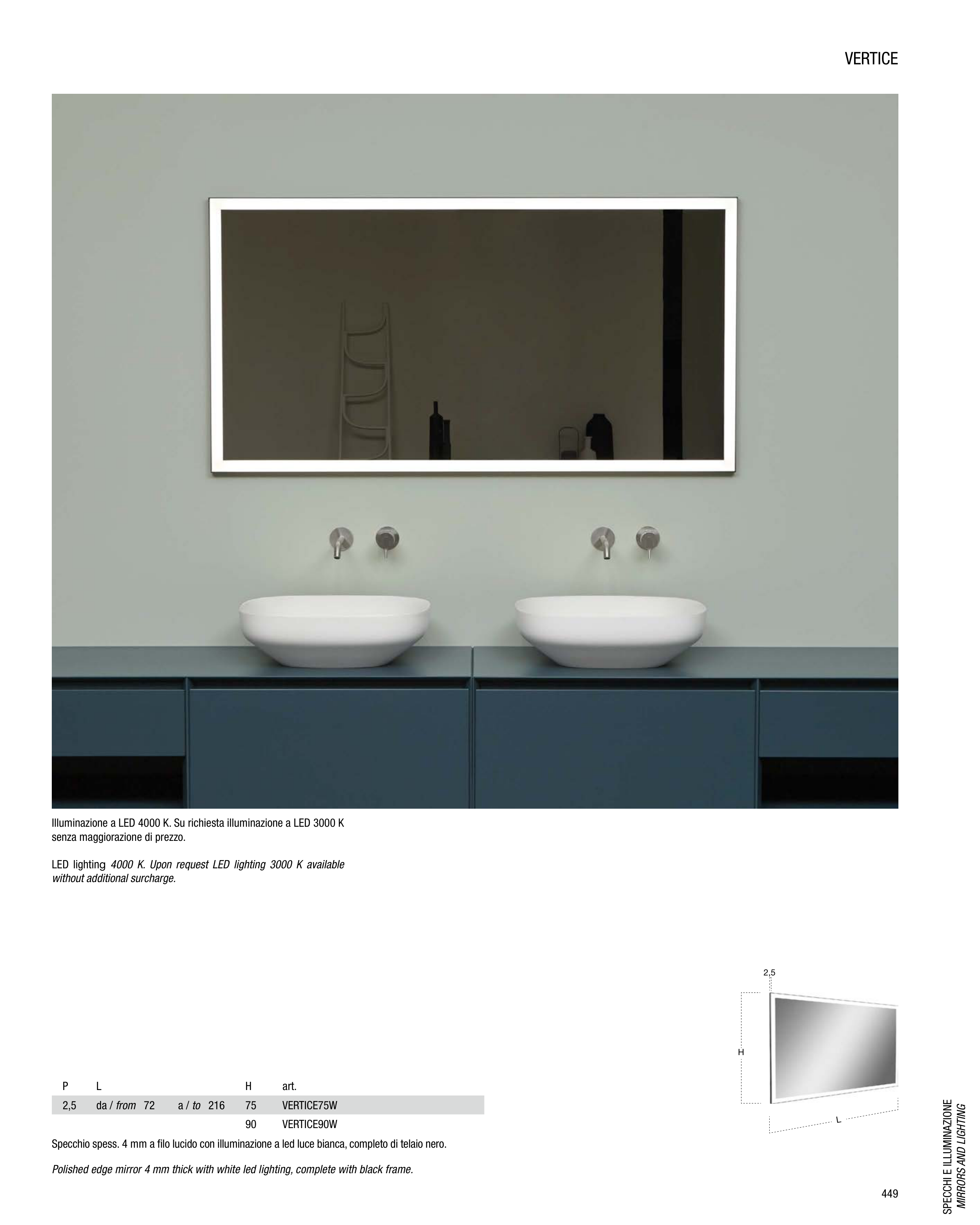 Specchio spess. 4 mm a filo lucido con illuminazione a led luce bianca, completo di telaio nero.