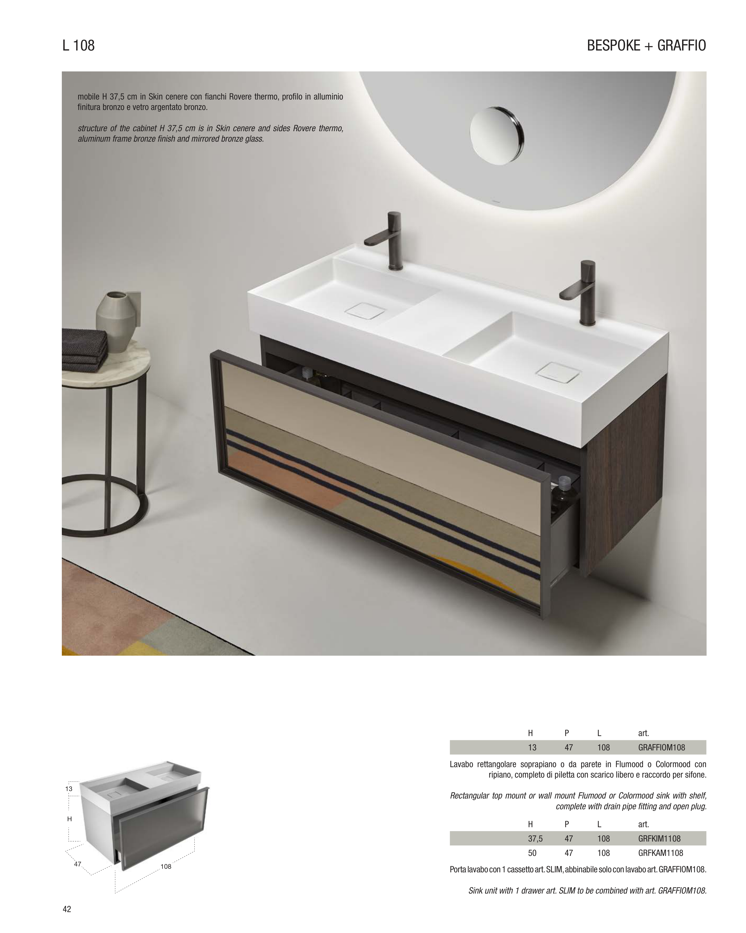 Sink unit with 1 drawer art. SLIM to be combined with art. GRAFFIOM108.