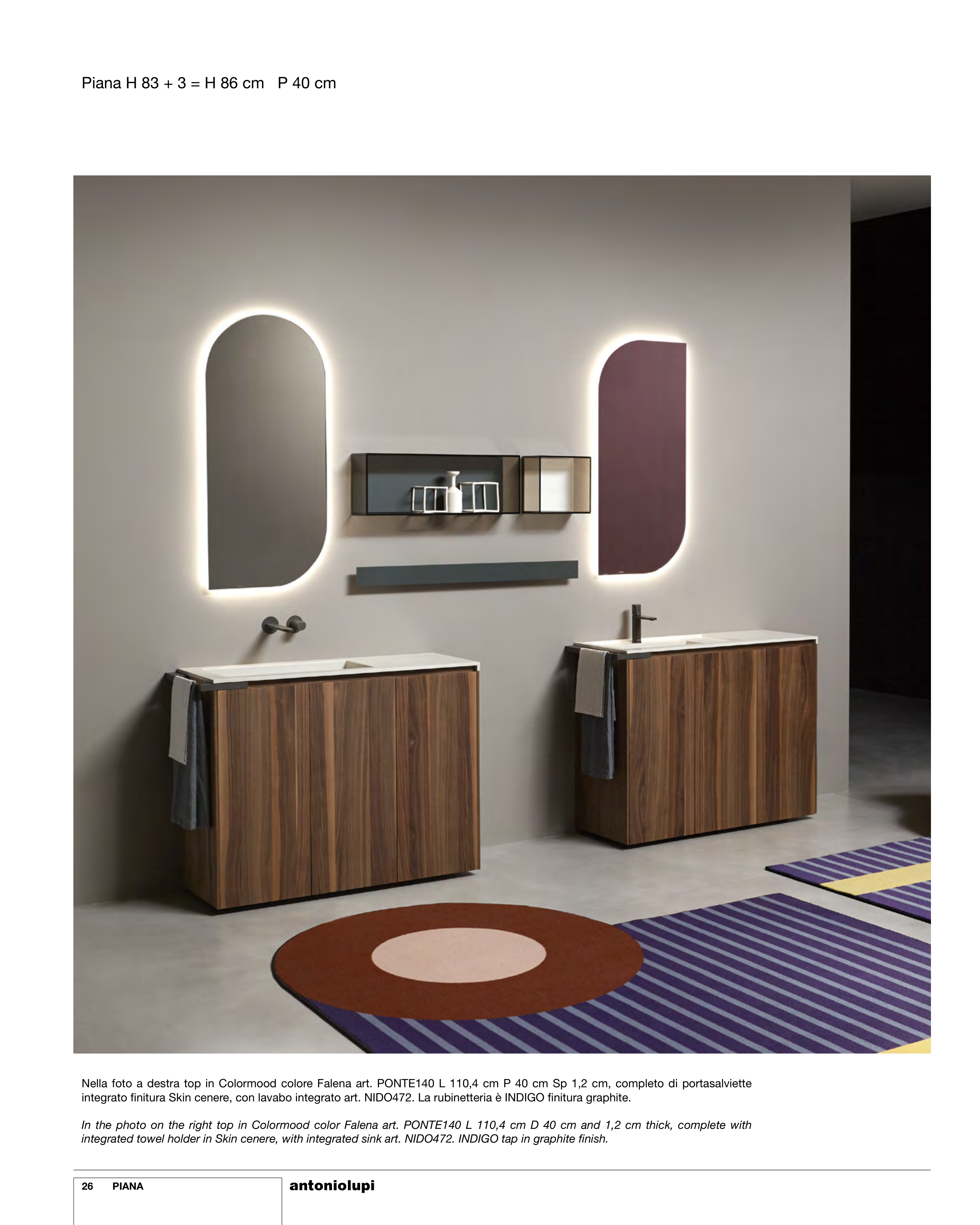 integrated towel holder in Skin cenere, with integrated sink art. NIDO472. INDIGO tap in graphite finish.