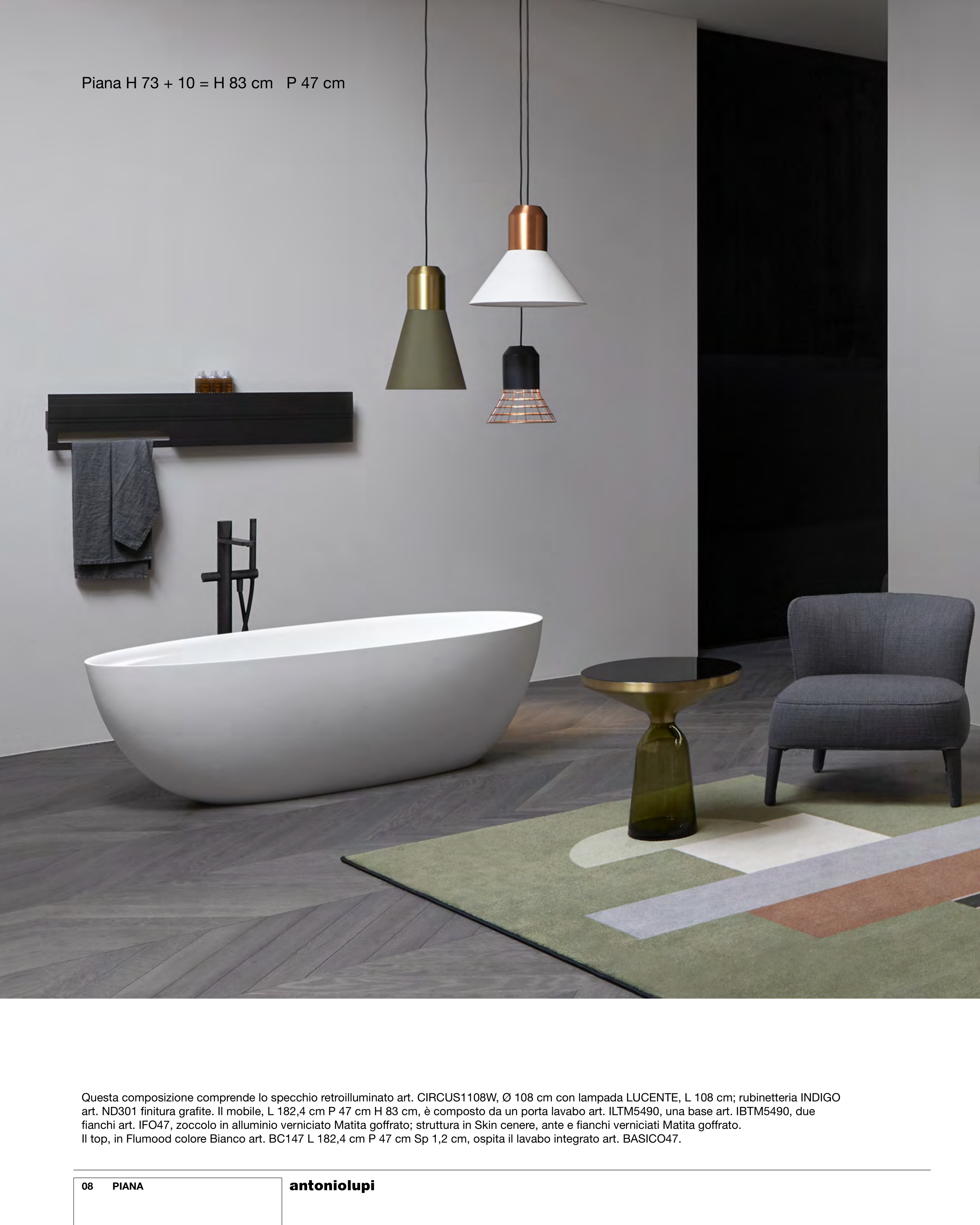 art. ND301 finitura grafite. Il mobile, L 182,4 cm P 47 cm H 83 cm, è composto da un porta lavabo art. ILTM5490, una base art. IBTM5490, due