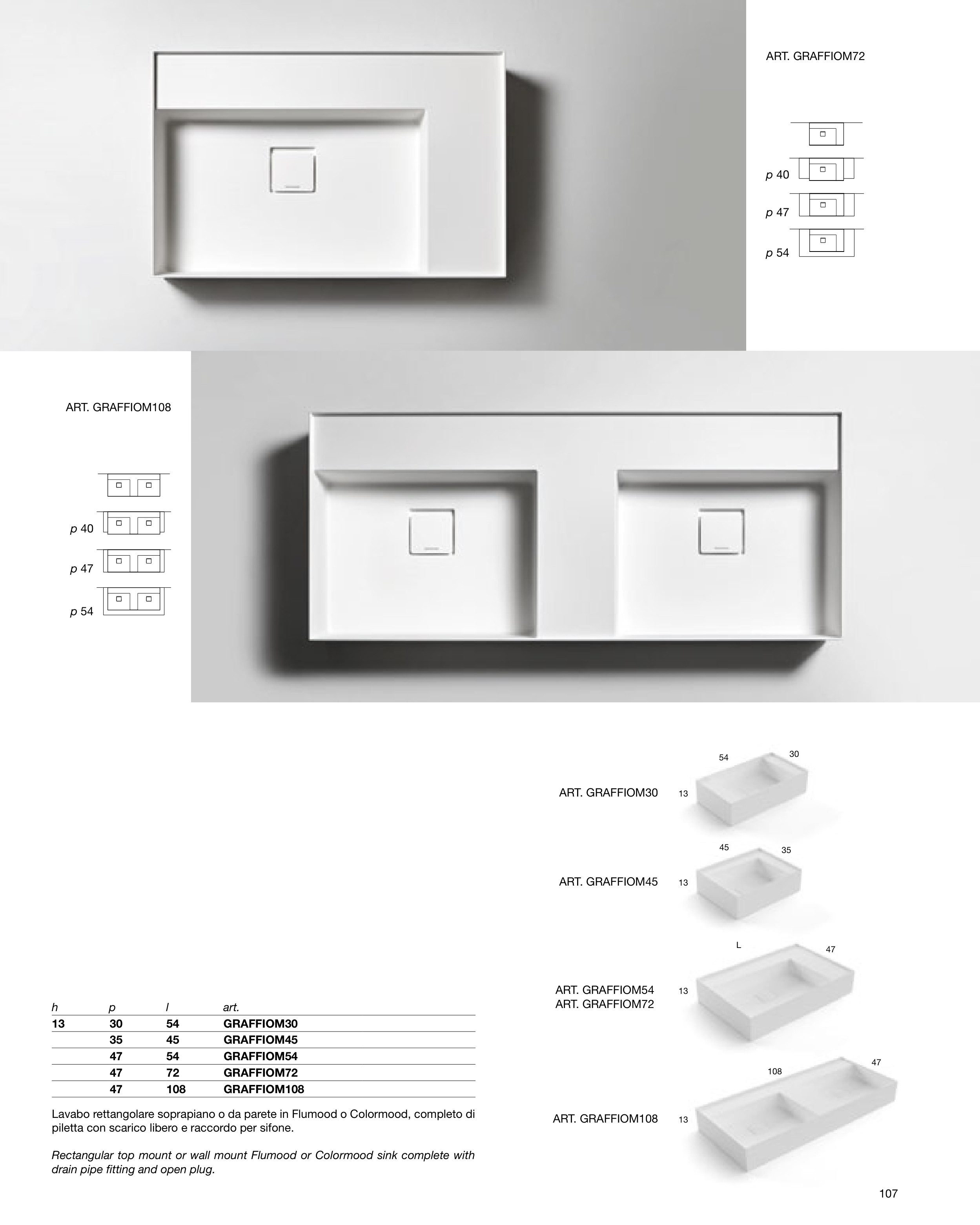 Lavabo rettangolare soprapiano o da parete in Flumood o Colormood, completo di