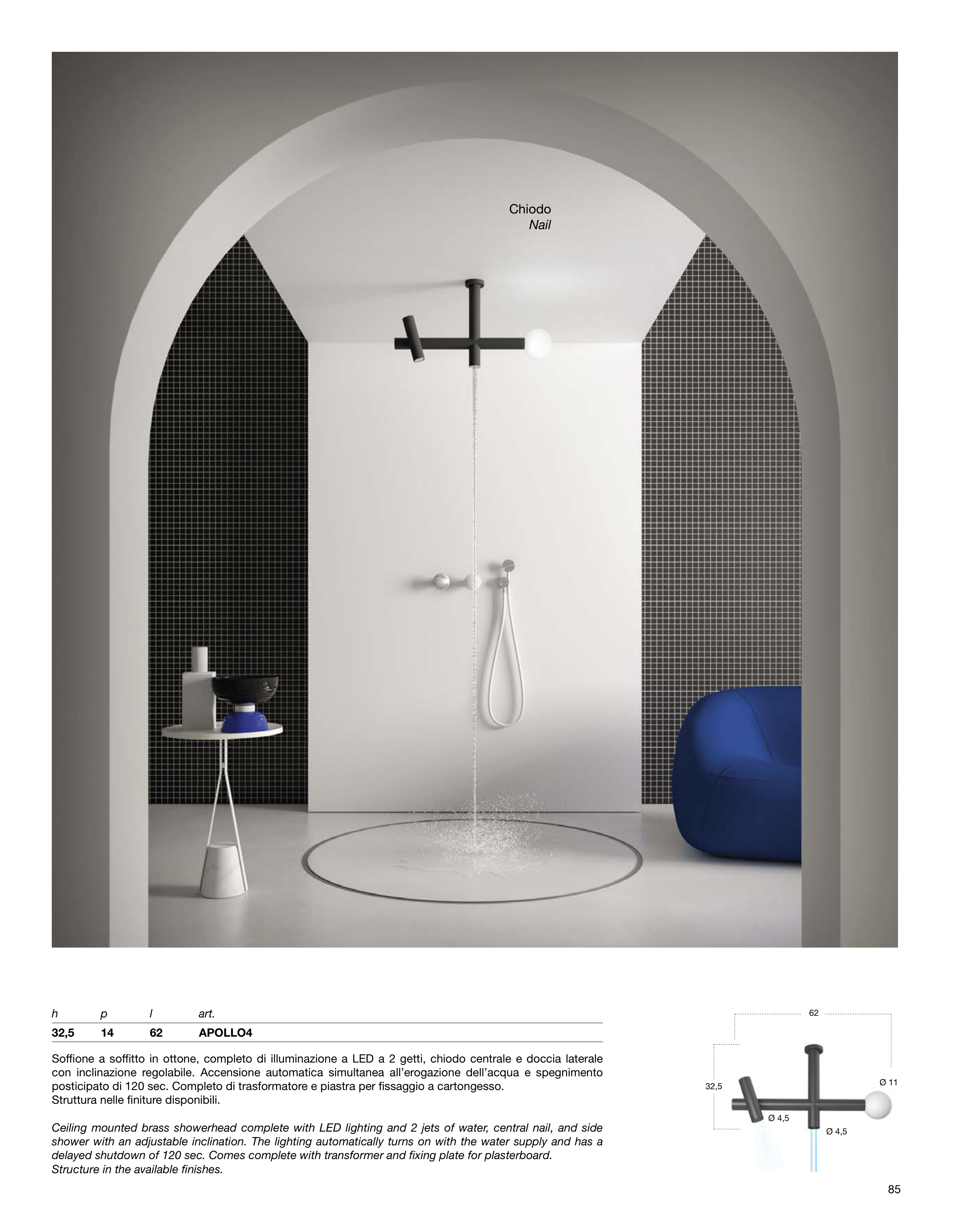 Soffione a soffitto in ottone, completo di illuminazione a LED a 2 getti, chiodo centrale e doccia laterale