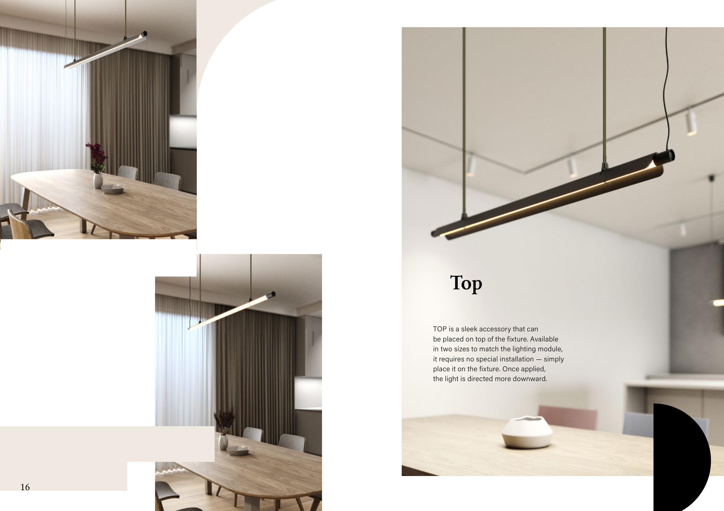 Top TOP is a sleek accessory that can be placed on top of the fixture. Available in two sizes to match the lighting module, it requires no special installation — simply place it on the fixture. Once applied, the light is directed more downward. 17 16
