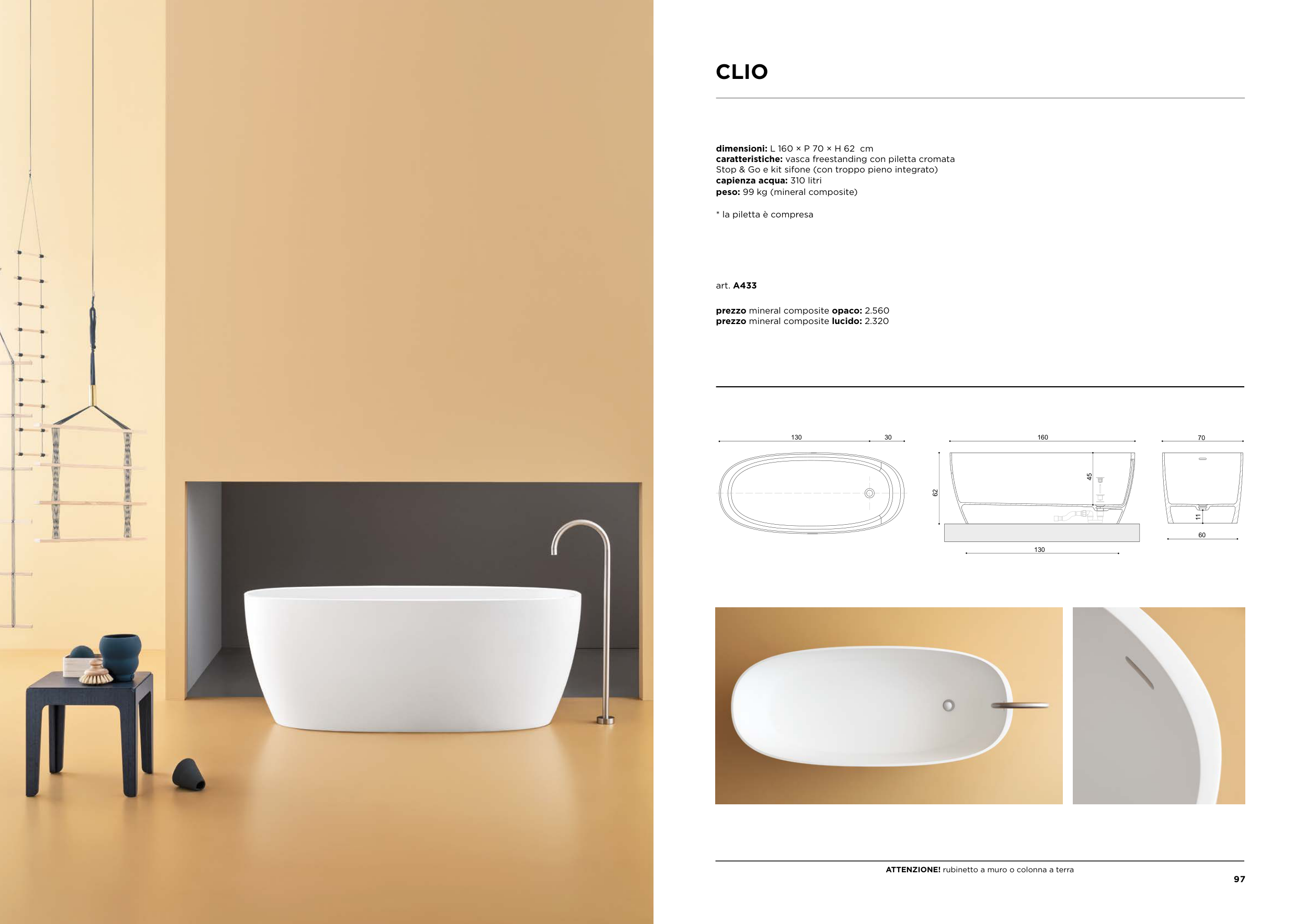 caratteristiche: vasca freestanding con piletta cromata
