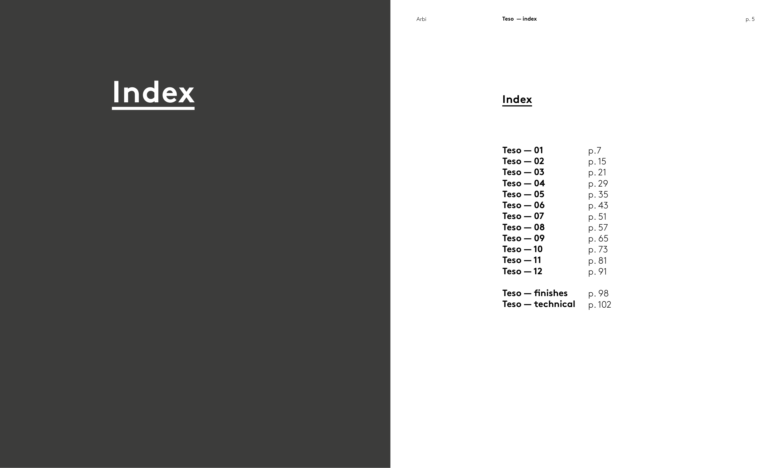 Arbi Arbi Teso Teso p. 5 — index Index Teso — 01 Teso — 02 Teso — 03 Teso — 04 Teso — 05 Teso — 06 Teso — 07 Teso — 08 Teso — 09 Teso — 10 Teso — 11 Teso — 12 Teso — finishes Teso — technical p.7 p. 15 p. 21 p. 29 p. 35 p. 43 p. 51 p. 57 p. 65 p. 73 p. 81 p. 91 p. 98 p. 102 Index