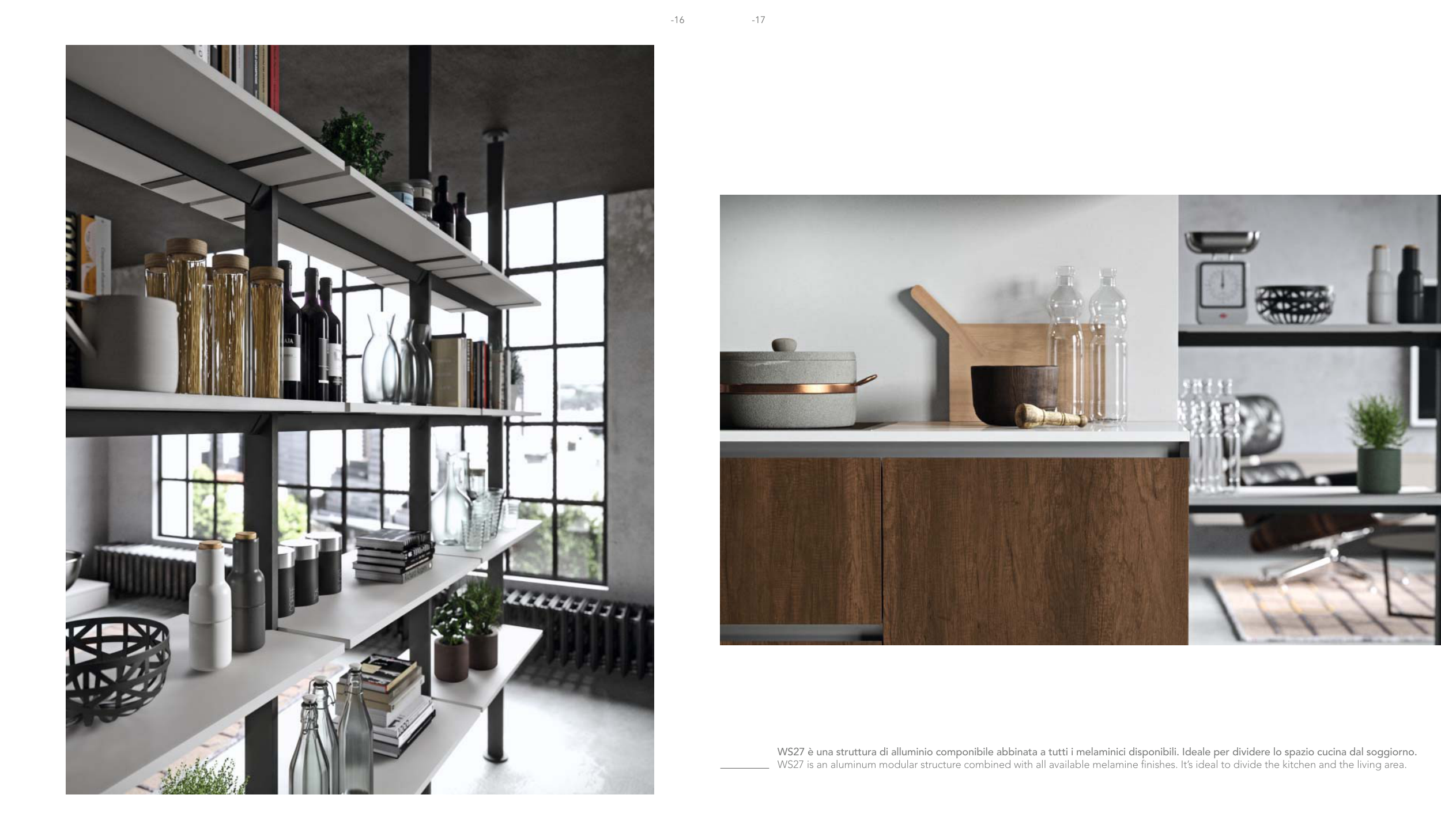 WS27 is an aluminum modular structure combined with all available melamine fi nishes. It’s ideal to divide the kitchen and the living area.