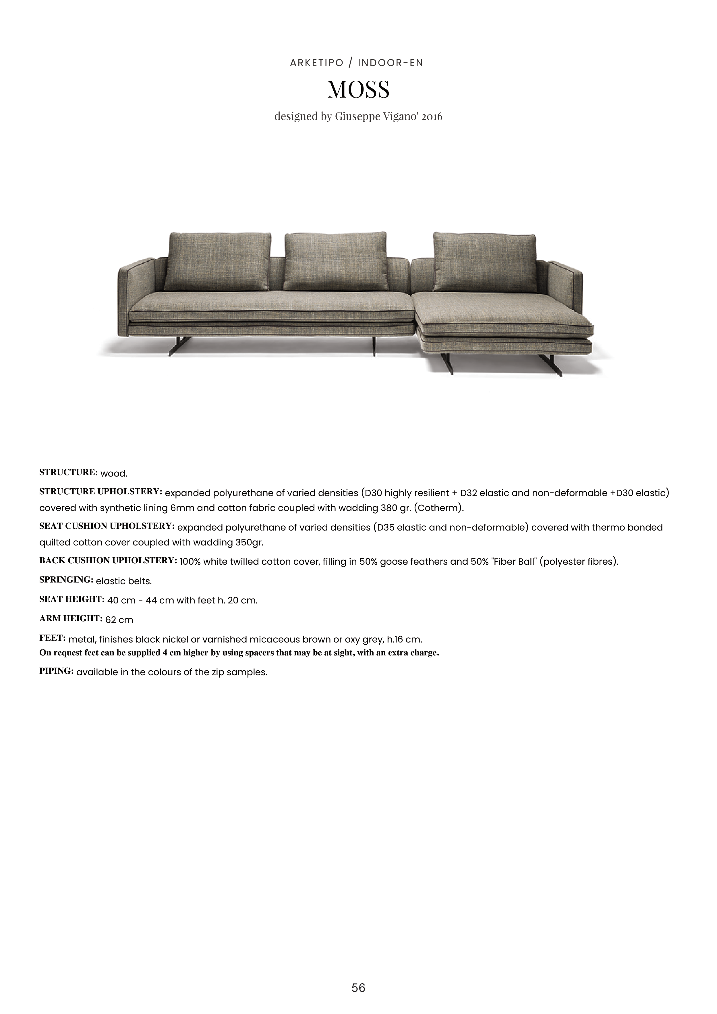 BACK CUSHION UPHOLSTERY: 100% white twilled cotton cover, filling in 50% goose feathers and 50% "Fiber Ball" (polyester fibres).