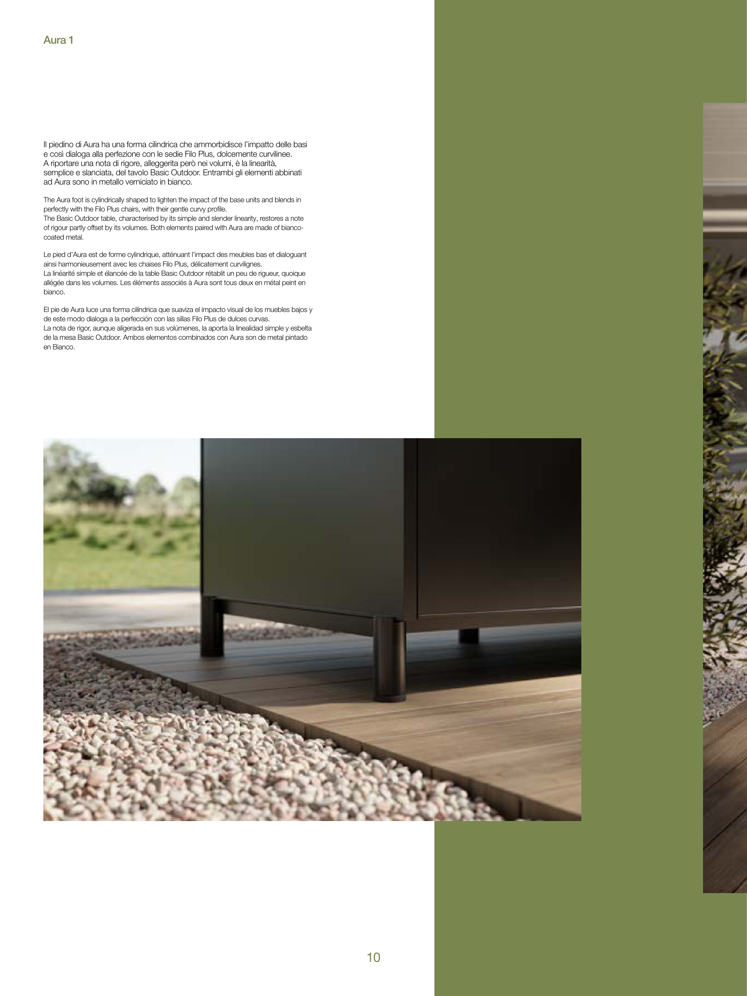 Le pied d’Aura est de forme cylindrique, atténuant l’impact des meubles bas et dialoguant