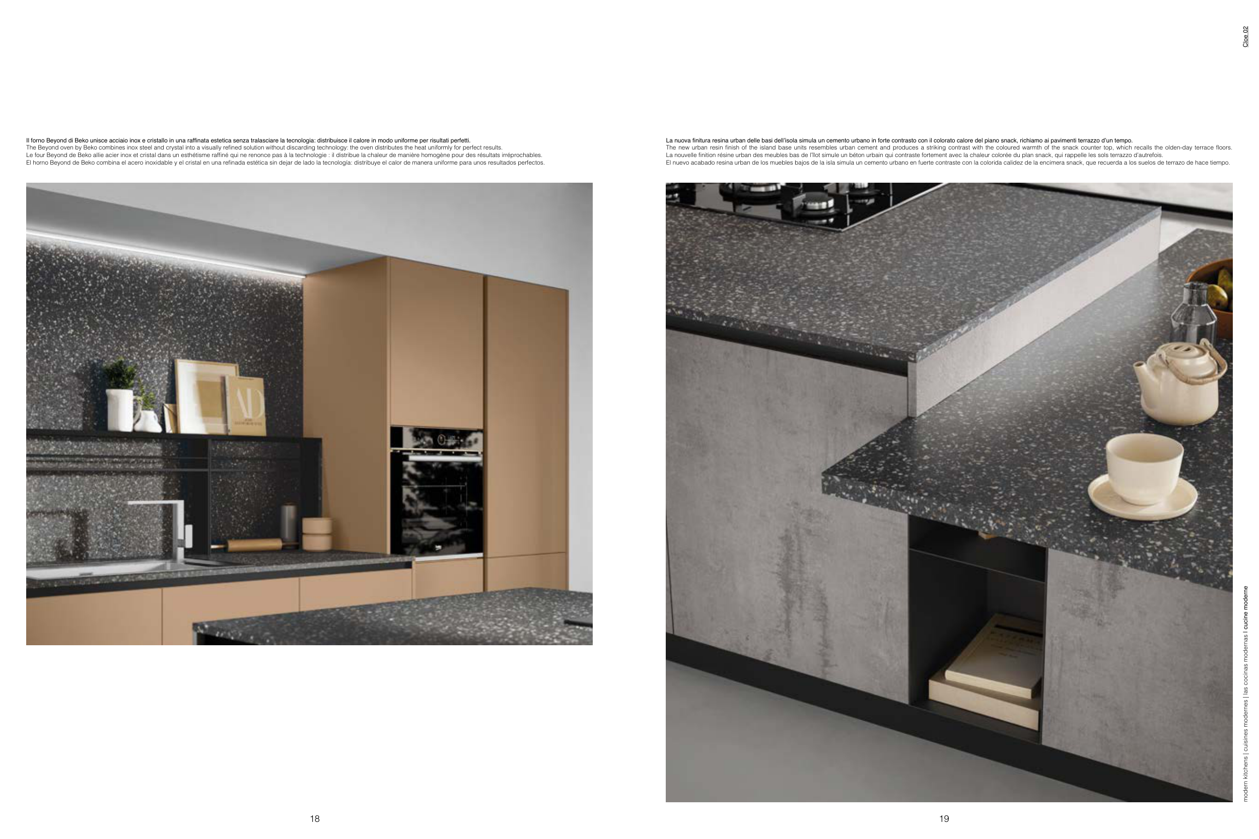 La nuova finitura resina urban delle basi dell’isola simula un cemento urbano in forte contrasto con il colorato calore del piano snack, richiamo ai pavimenti terrazzo d’un tempo.