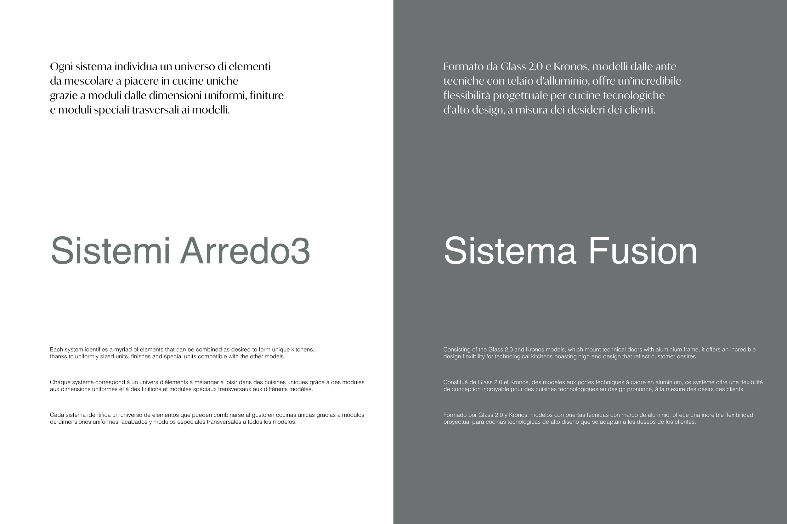 Each system identifies a myriad of elements that can be combined as desired to form unique kitchens,